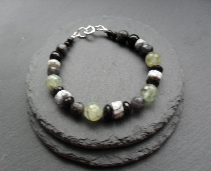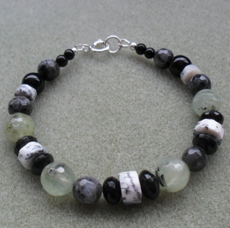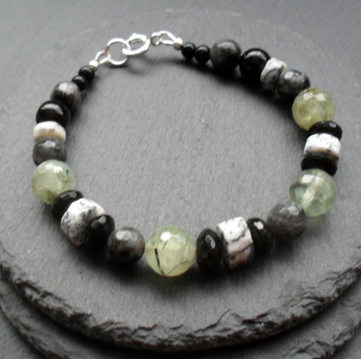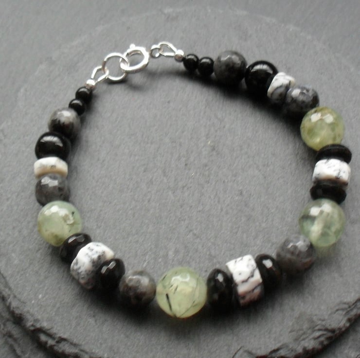 Dendrite opal which is white with black markings, prehnite which is a green colour and has some natural black markings within the stone,larvikite and black agate.