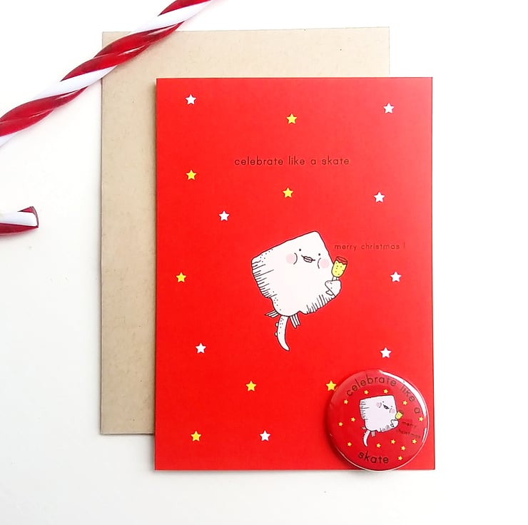 Skate is celebrating with a nice glass of bubbly ... card and badge set.