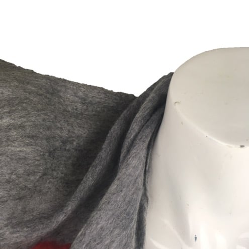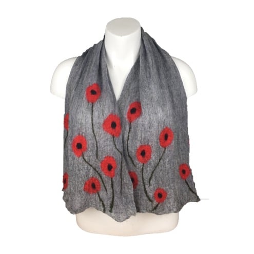A beautiful scarf in grey with a striking poppy design. This scarf has been made using merino wool fibres laid over silk chiffon and nuno felted. A poppy design has been added to one side of the scarf prior to felting with the reverse felted but left plain. Nuno felting is a process whereby woollen fibres laid over a silk chiffon fabric are worked in such a way as to force the fibres to migrate through the silk and bind with it.