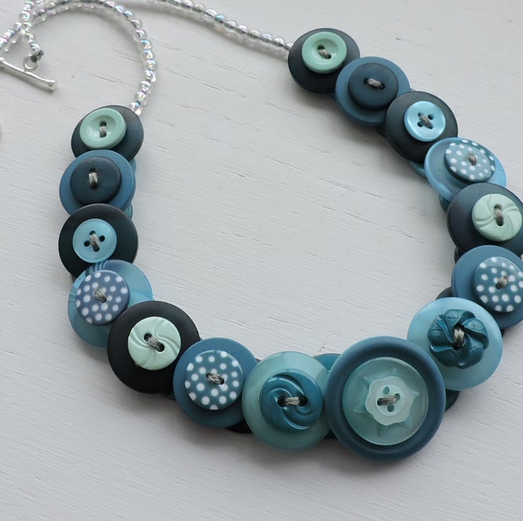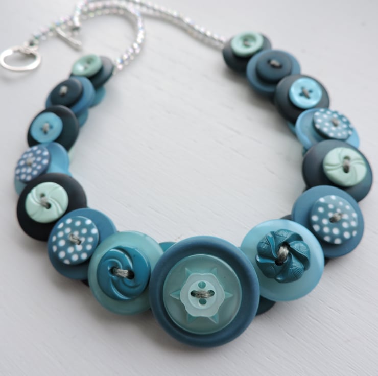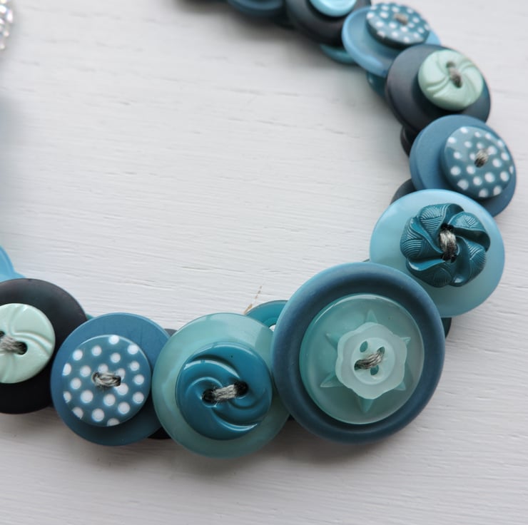 I've made this pretty button necklace by layering and stacking an assortment of teal and turquoise buttons with a splash of white.