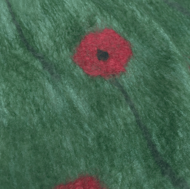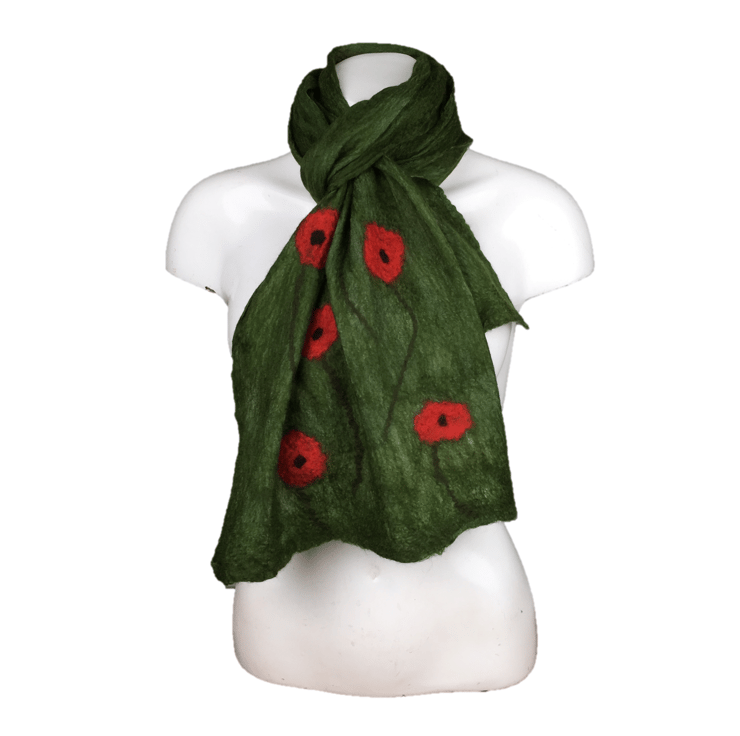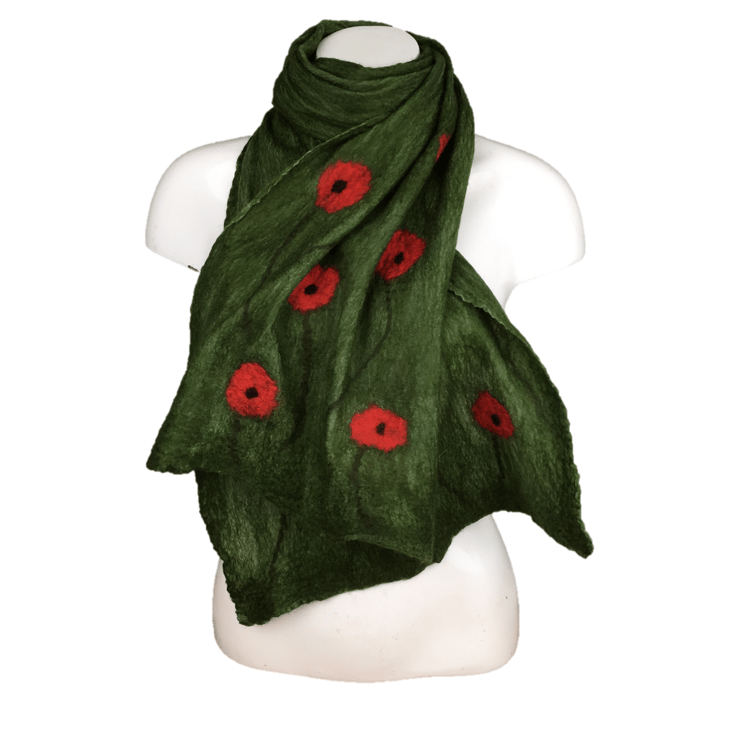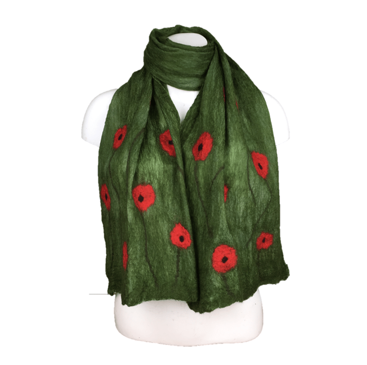Beautifully soft and warm yet still lightweight this scarf has been made using merino wool nuno felted on silk chiffon. Fine layers of green merino wool have been laid over both sides of a silk chiffon base fabric, a poppy design has been added to one side and the scarf has been nuno felted.
