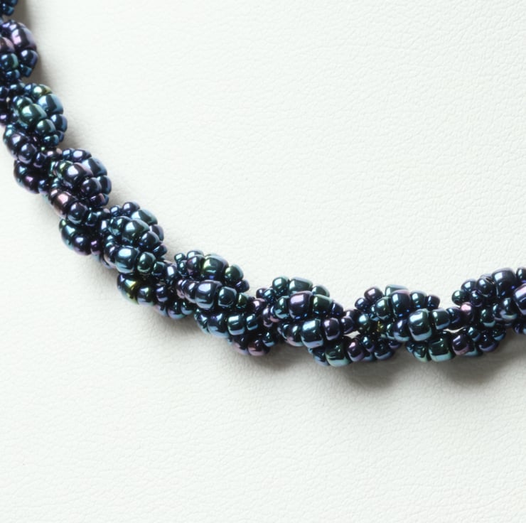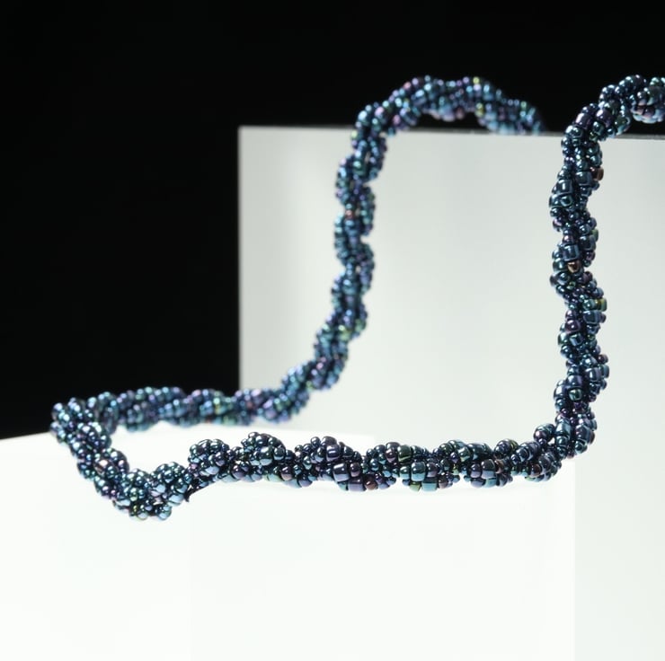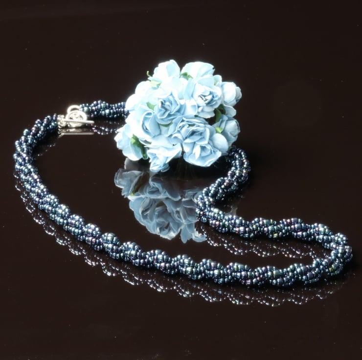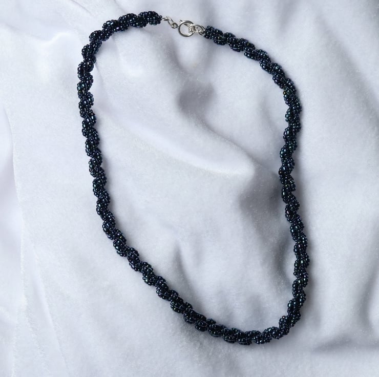 This little necklace is ideal for someone who likes something understated yet attractive. The seed beads from which it is made are a pretty metallic dark blue with a slight iridescent sheen of green with an occasional touch of purple. The beads are woven into a simple spiral weave; the undulating shape of the spiral adds interest.