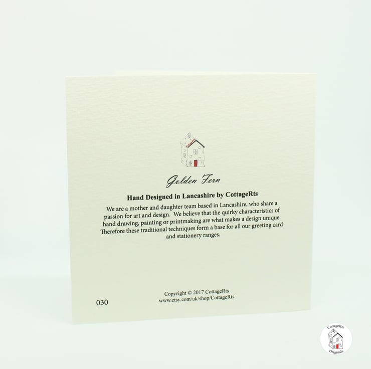This fern leaf design was taken from one of original hand printed leaf mono-prints which has then been digitally printed on 350gsm watercolour paper. The card has then been hand finished/painted with gold acrylic.