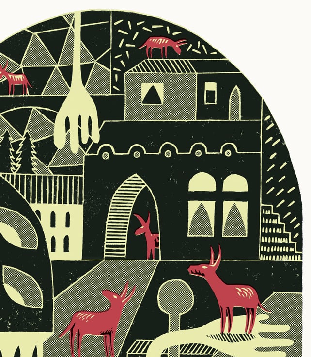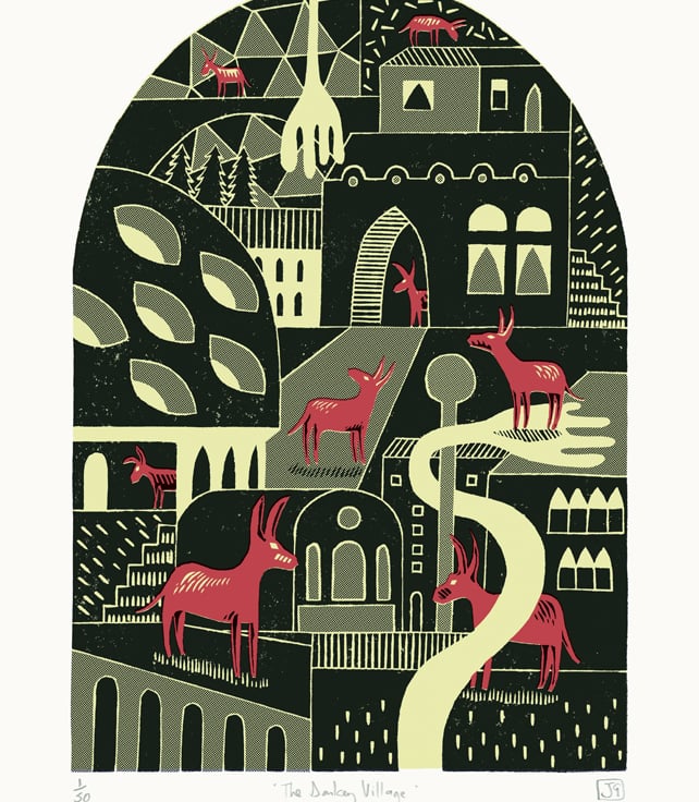 This is one of my many donkey-themed prints. On this occasion we find the donkeys inhabiting a curious village. Was it built for them? Did they build it? One thing is for certain. The helping hands are back..