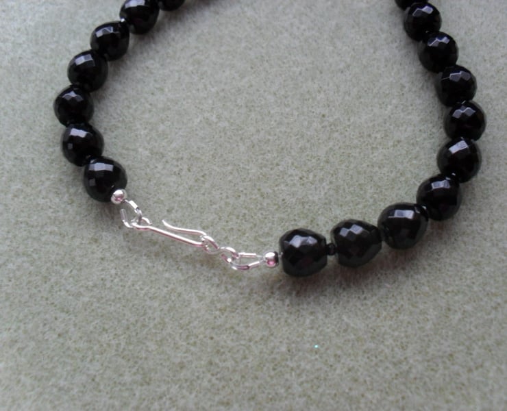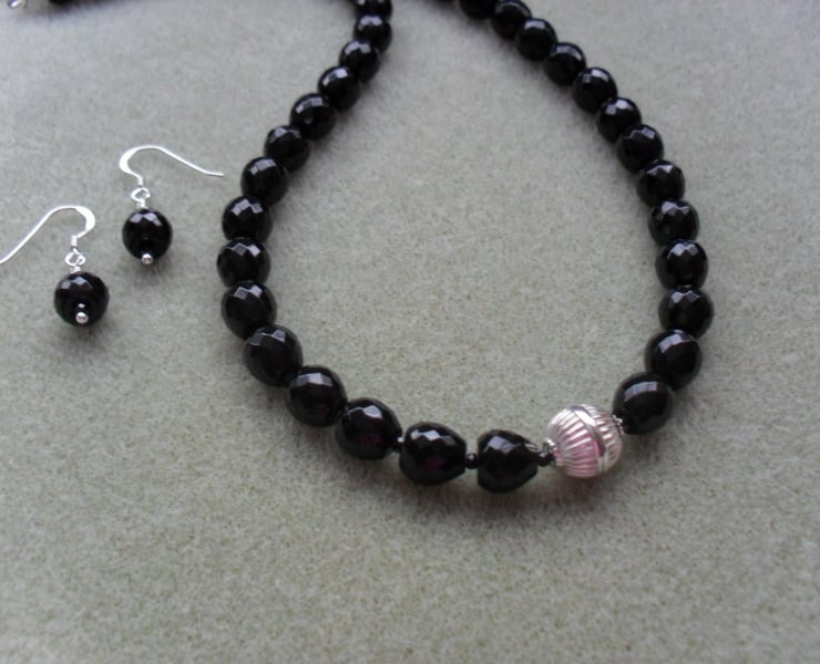 Faceted black onyx and faceted small black spinel semi precious gemstone necklace and earrings. The gemstones being faceted give the necklace and earrings some sparkle.