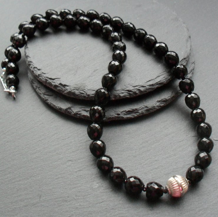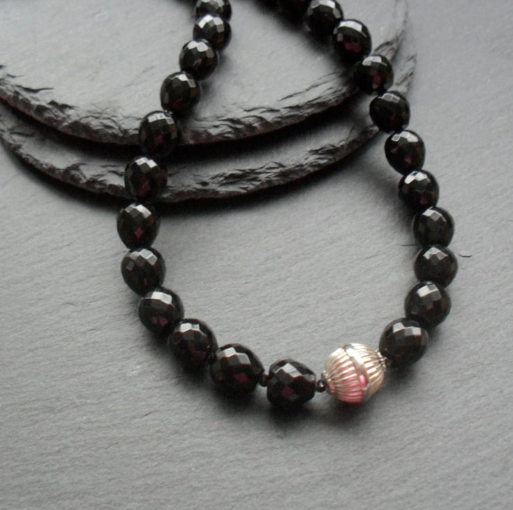 The necklace has a sterling silver hook and eye clasp,.and a large sterling silver bead in the centre