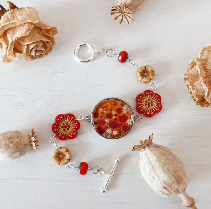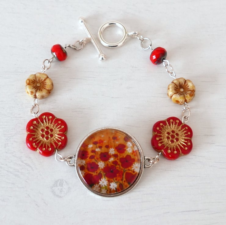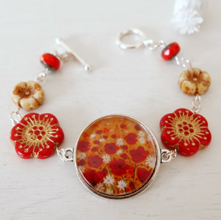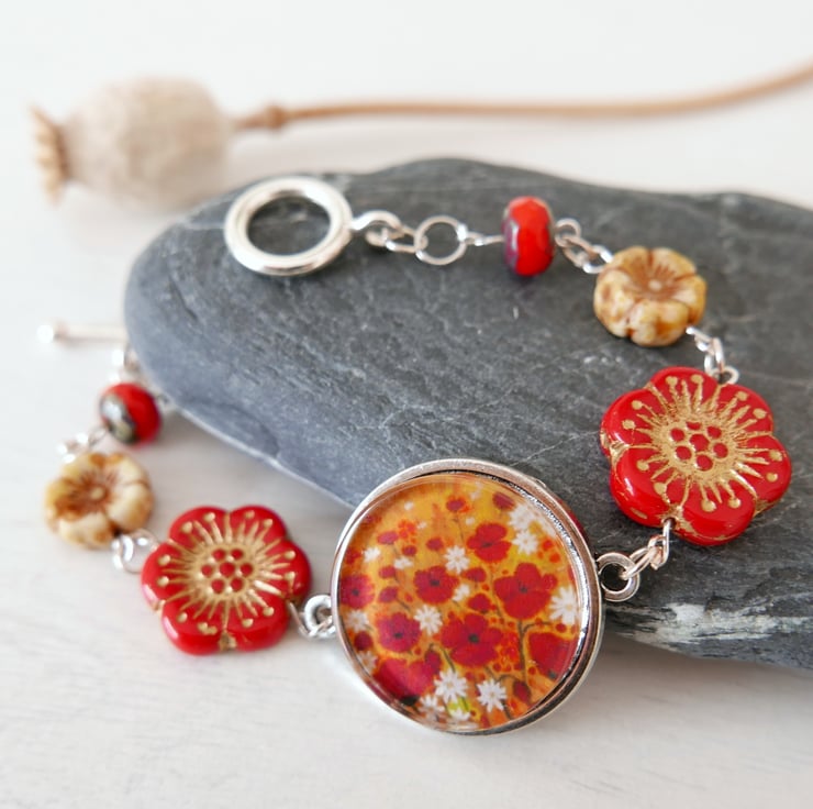 I made this red bracelet using a poppy pendant connector with an art print after my original mixed media painting 'Poppy Meadow'. I also used red Czech glass flowers, red Czech glass beads and yellow-brown Czech glass flowers. The pendant is approx 1" round and the bracelet is just under 8" and it closes with a toggle clasp.