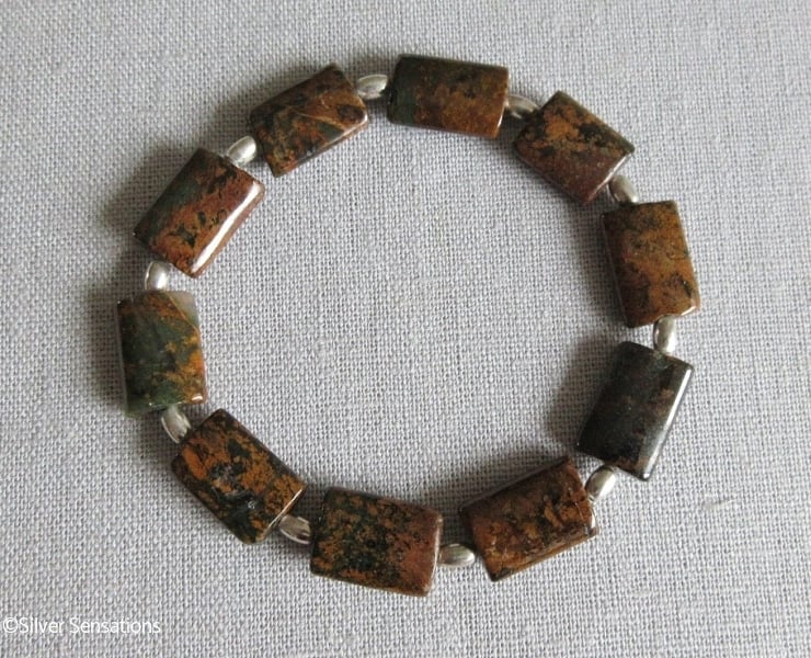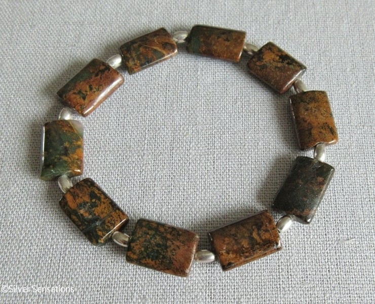 I designed this stretch bracelet with a simple style in mind, so I chose Rainbow Jasper oblong beads with brown & green random colours.