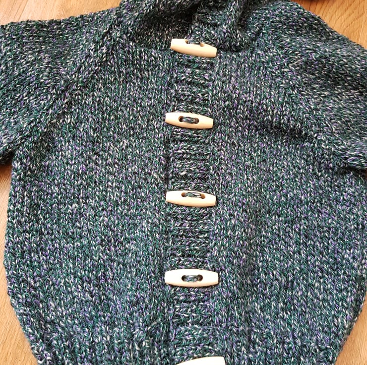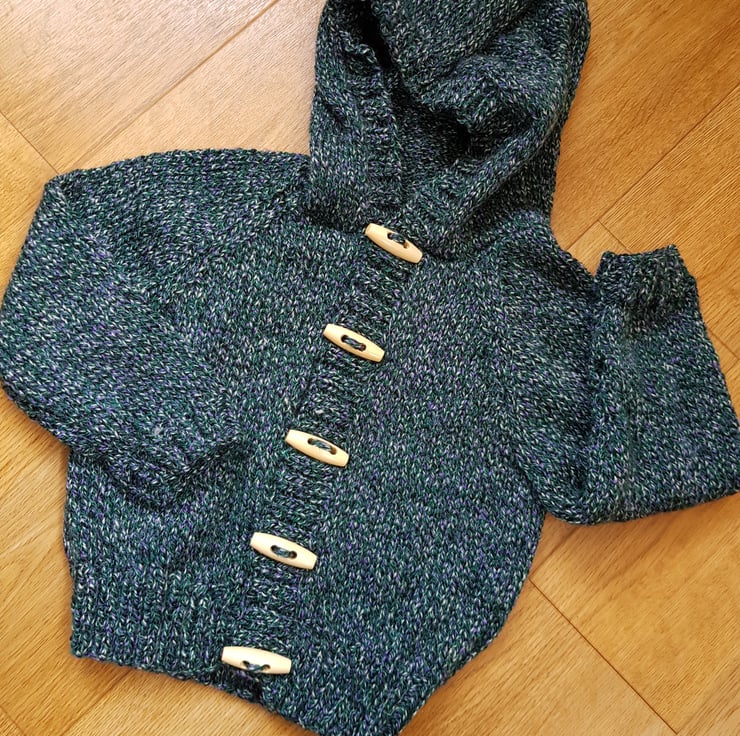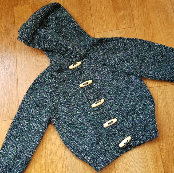 Knitted in a tweedy yarn which is teal with flecks of purple and black. I love the colours so I have kept the stitches plain. It has raglan sleeves and a little hood and wooden toggle buttons.