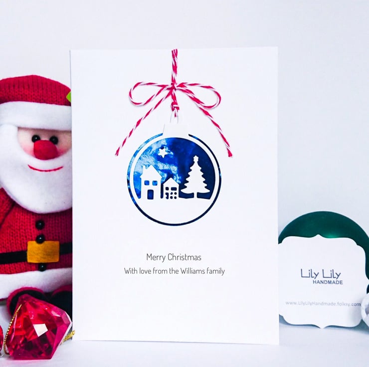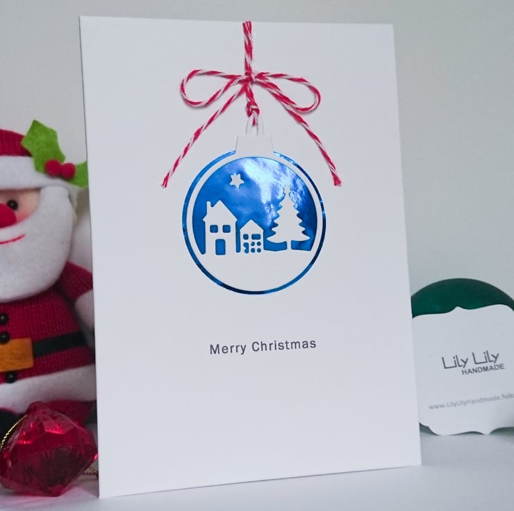 A striking contemporary Christmas card handcrafted by Lily Lily Handmade, featuring a Christmas bauble scene cut from midnight blue metallic paper and card. The bauble is embellished with co-ordinating red and white soft twine to complete the design.