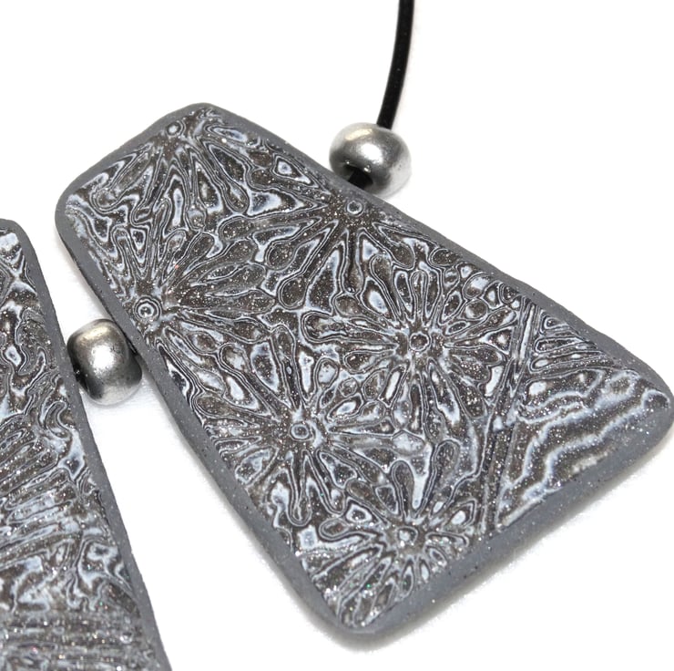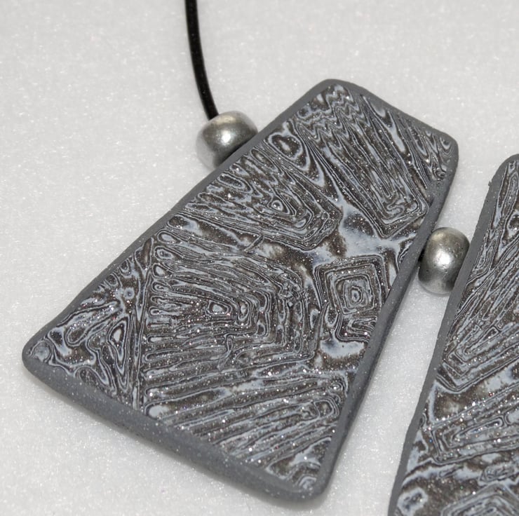 The necklace has been made by me from Polymer Clay. The process involves blending colours of raw clay and creating a surface pattern by indenting the clay and then carefully shaving away layers to produce an interesting design.