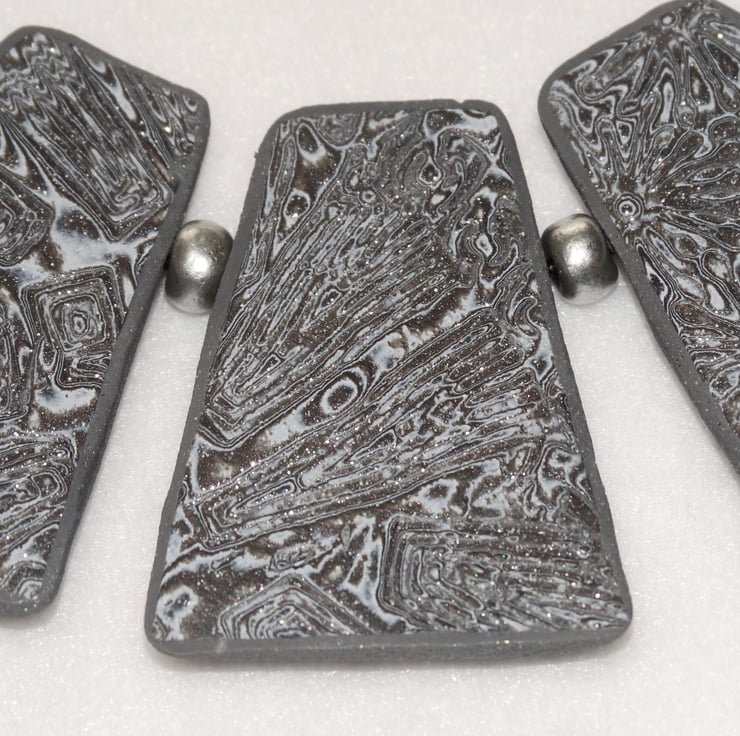 Each of the 3 beads has been made by applying this design veneer to the bead shape. The beads are baked to harden the clay, a textured clay backing sheet is then applied and the beads are baked again to harden the backing clay.