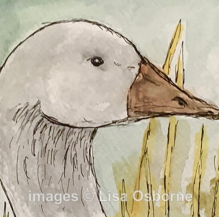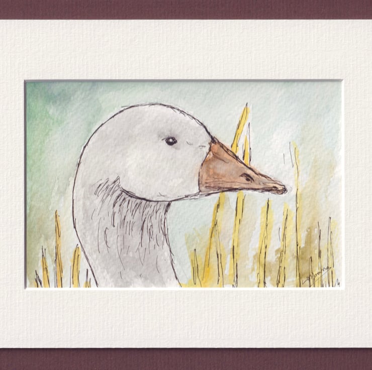 Original pen, ink and watercolour of a white goose.