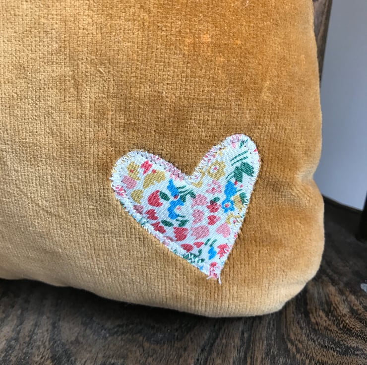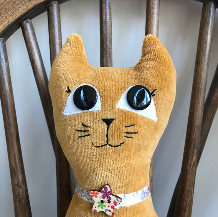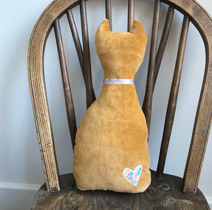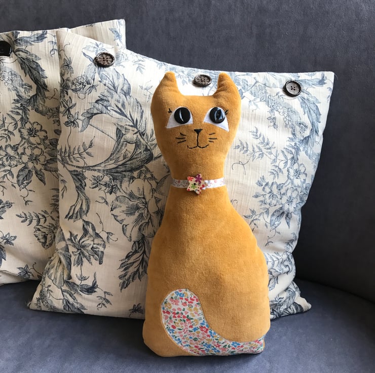 Cute retro style cushion in the shape of a cat, made from soft gingery reclaimed cotton velvet and decorated with appliqué details in ditsy floral cotton. The face is hand embroidered and the collar is a pretty floral ribbon trimmed with a wooden star button.