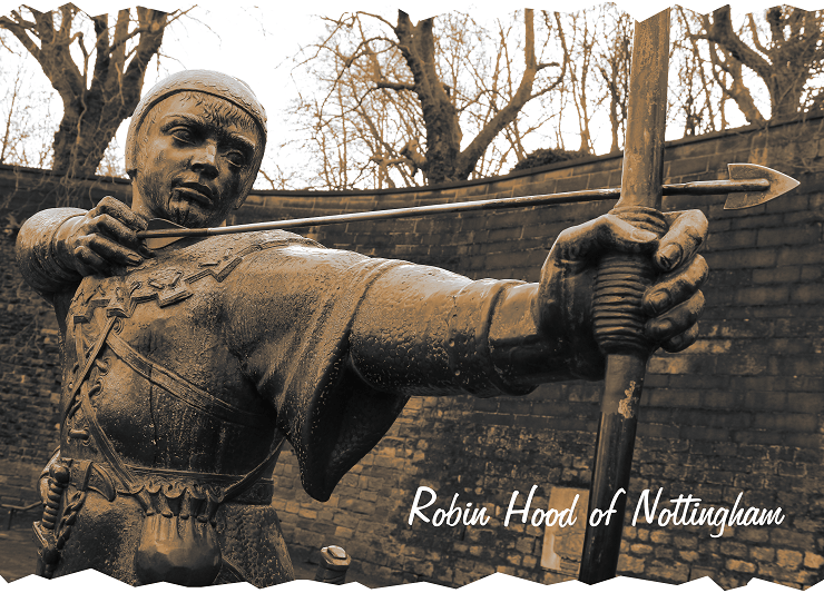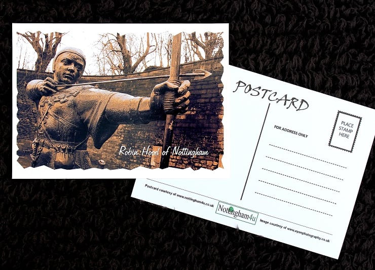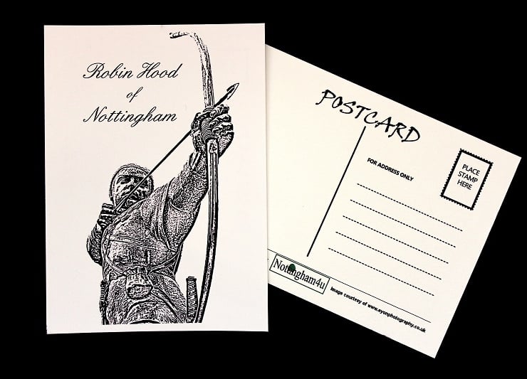 This pack contains two postcards, both with an image of the Robin Hood Statue in Nottingham.