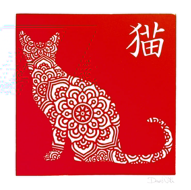 This design took a very long time to carve due to the fine detail and was inspired by a childhood toy (actually a psychedelic sea horse - which may feature in a future print). The Japanese script represents 'cat' in case you were wondering.