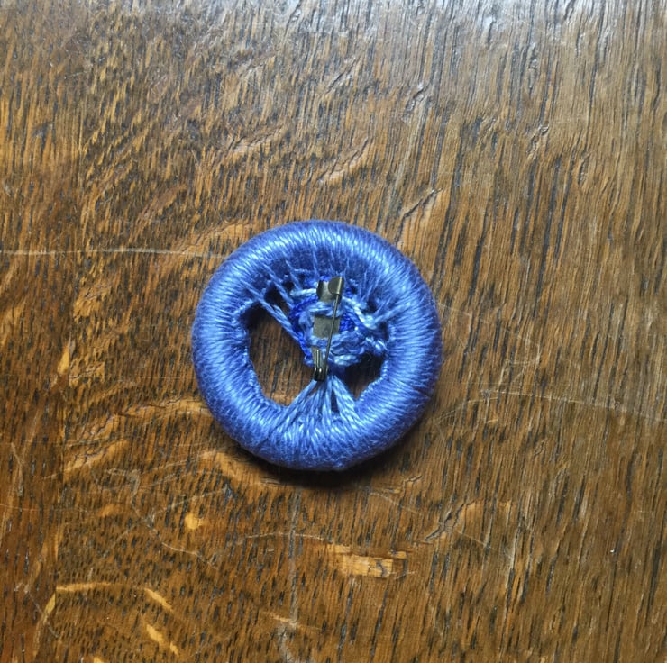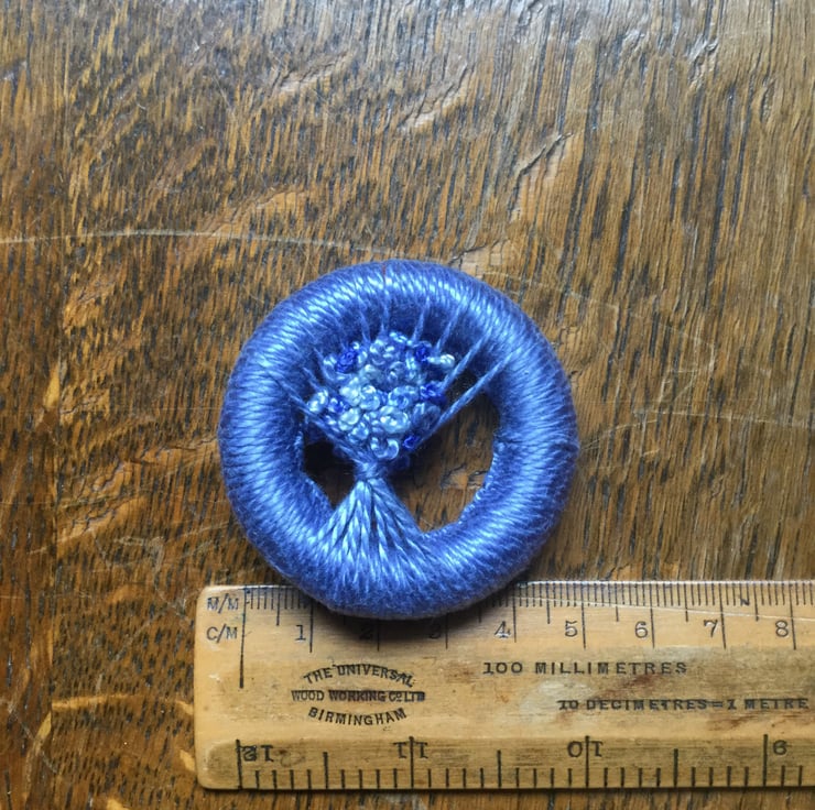 It is worked on a wooden ring and measures 5 cm across. The ring is covered in a blue cotton thread and the posy blossoms are worked in French knots in shades of blue.
