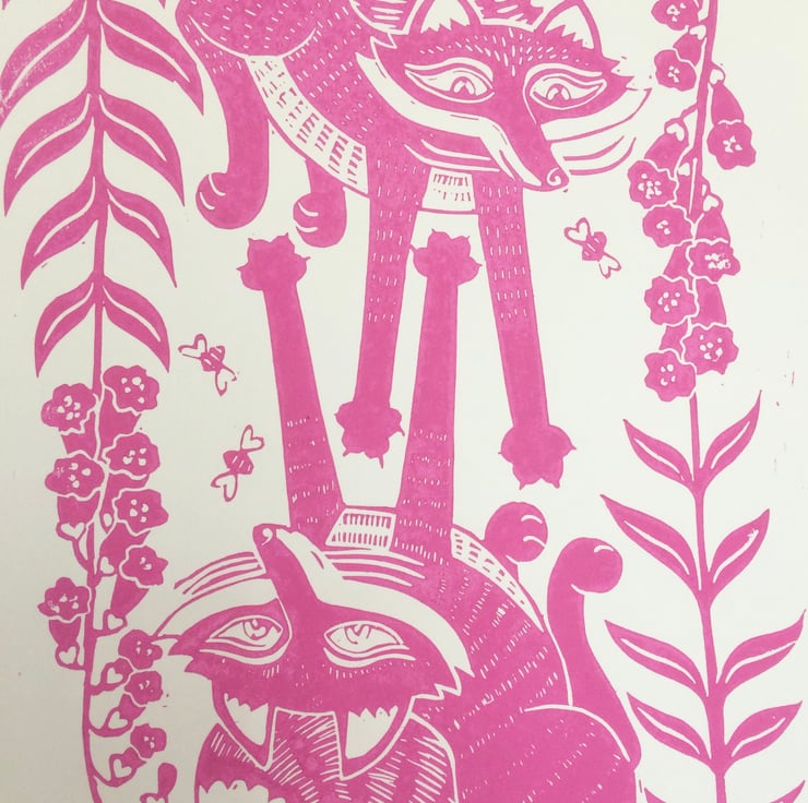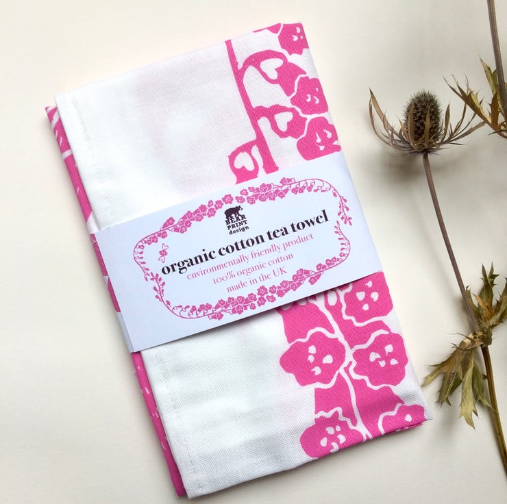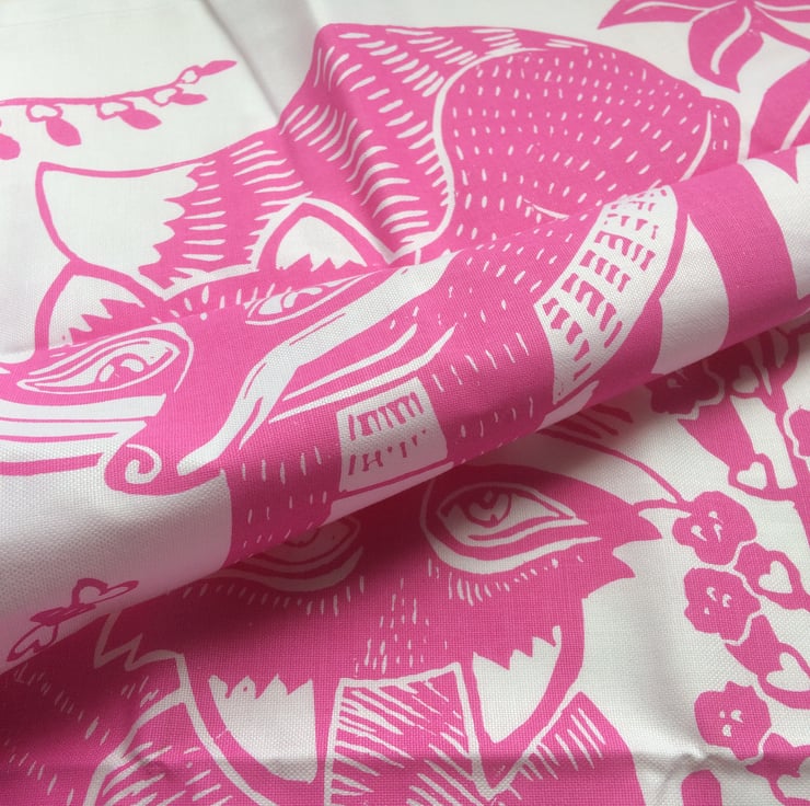 Tea towels make lovely affordable house warming gifts, and this one featuring two playful foxes is sure to be well received. Screen printed using environmentally friendly inks in a gorgeous shade of pink, the design is taken from an original Lino print design. The tea towel is made from 100% organic cotton and is superb quality. It has a hanging loop and comes packaged with a belly wrap and tag describing the folklore influence of the design. It measures a generous 48cm x 76cm and will be carefully packaged and posted within 3 working days. Also available as a limited edition Lino print.