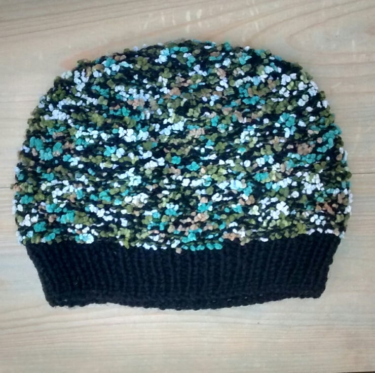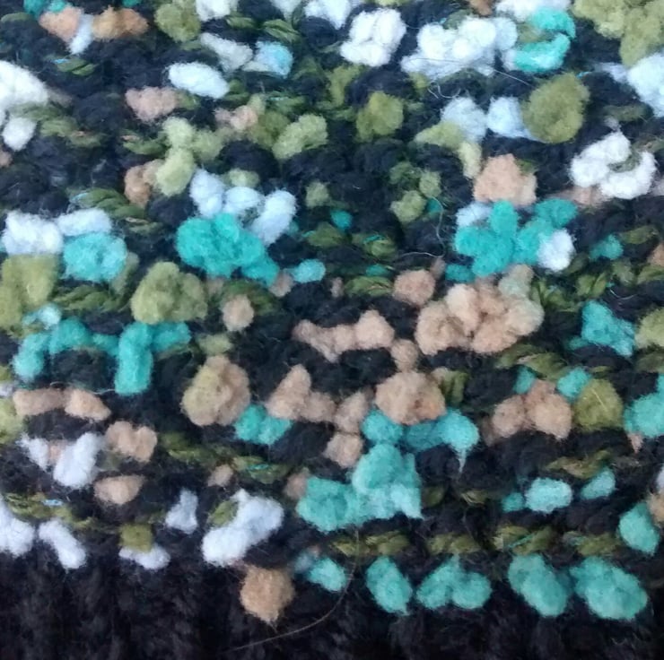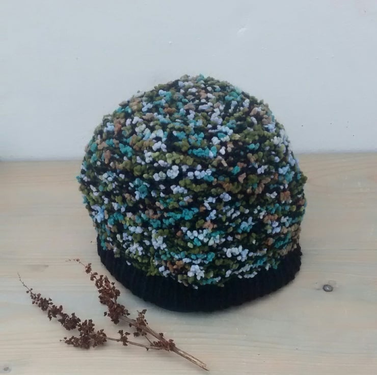 Cosy and soft multi-coloured chunky weight hand knit hat in a lovely wool and acrylic blend. This beanie hat is knit in a turquoise, caramel, olive and blue boucle fleece type yarn which is soft and thick with a black wool and acrylic ribbed rim.