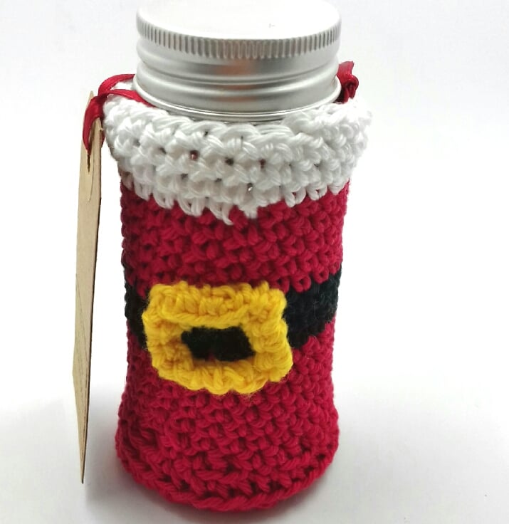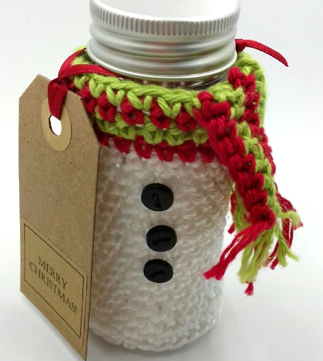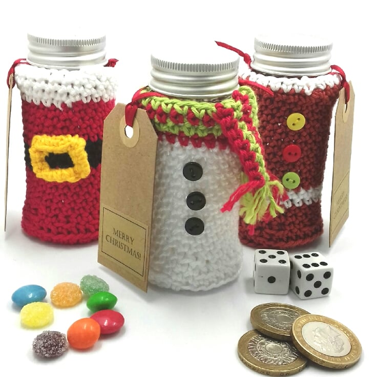 Three little pots with festive covers to add novelty to your Christmas gifts. The lidded plastic pots are re-purposed cake decoration pots that once contained sprinkles and mini chocolate beans. They have covers crocheted in cotton and decorated with buttons. Each bears a tag attached with narrow satin ribbon. The tags currently read 'Merry Christmas ' although I am very happy to exchange these for tags with a personal greeting. The pots measure approximately 9 cm tall with a diameter of 3 cm. They can be filled cheaply or more expensively with so many gifts from sweets to hair ties, from coins to game pieces. They could be filled with small items of school equipment for a teacher's gift. They will hold approximately 80g of the types of sweets in the photograph and up to 30 £2 coins! No contents are included. If you wish to save on postage by using your own pots (these were from Sainsbury's) please message me and I will post for £1.50 and refund the difference.