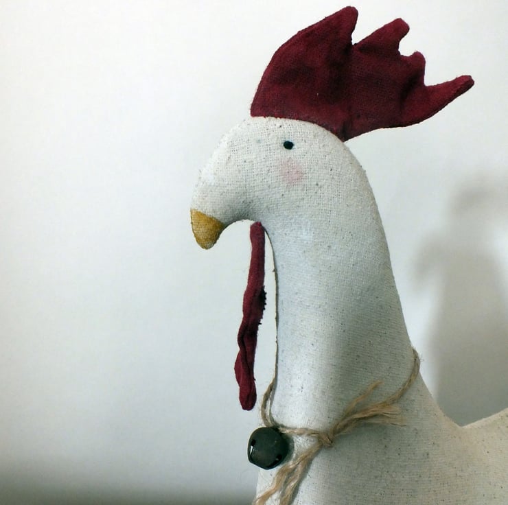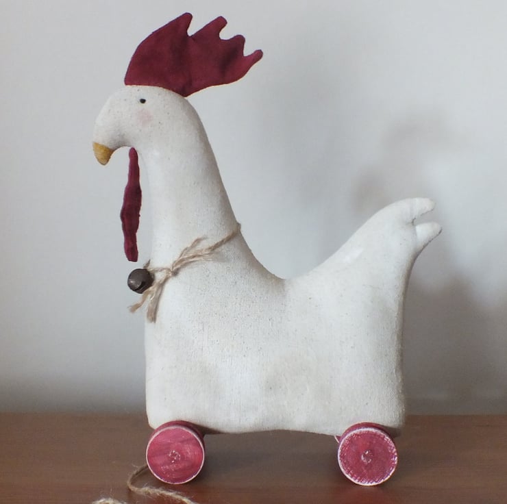 Primitive Chicken is made from Osnaberg fabric painted with coffee tinted, white acrylic paint, then gently sanded. The comb and wattle are also painted fabric.The wooden wheels and axle have been given two coats of paint , then sanded back for a vintage look.