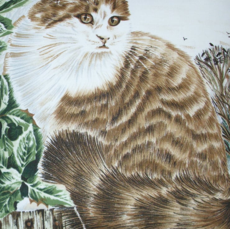 A square cushion with a beautiful fluffy tabby and white cat with golden brown eyes sitting upright on a garden fence . lovely and soft cushion , would look good in any lounge, sitting room, study or office on any settee or armchair or in a conservatory or summer house or on a bed.
