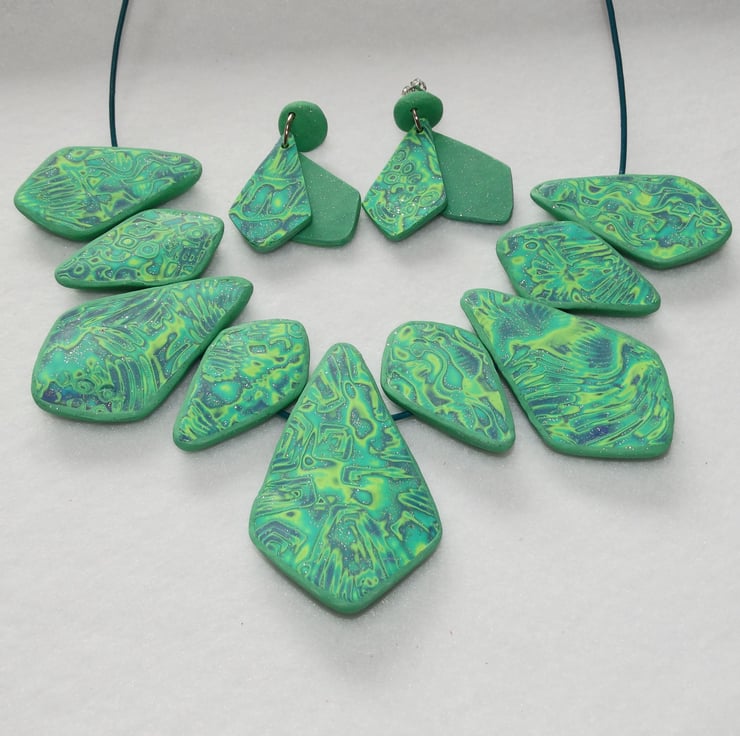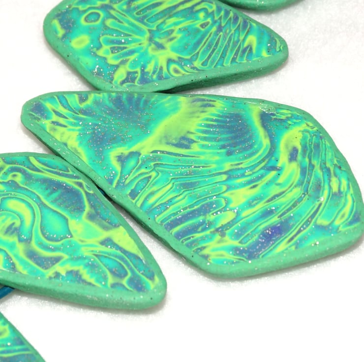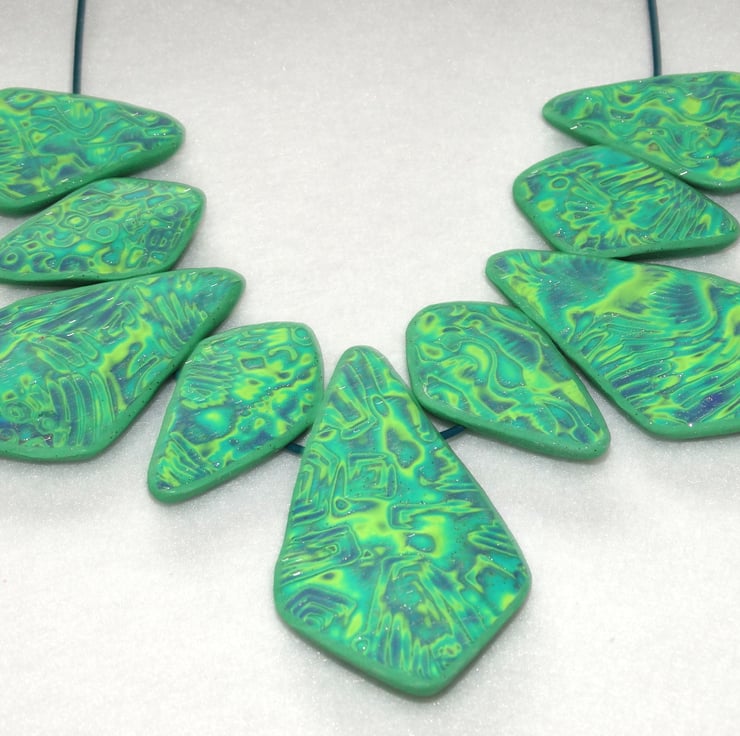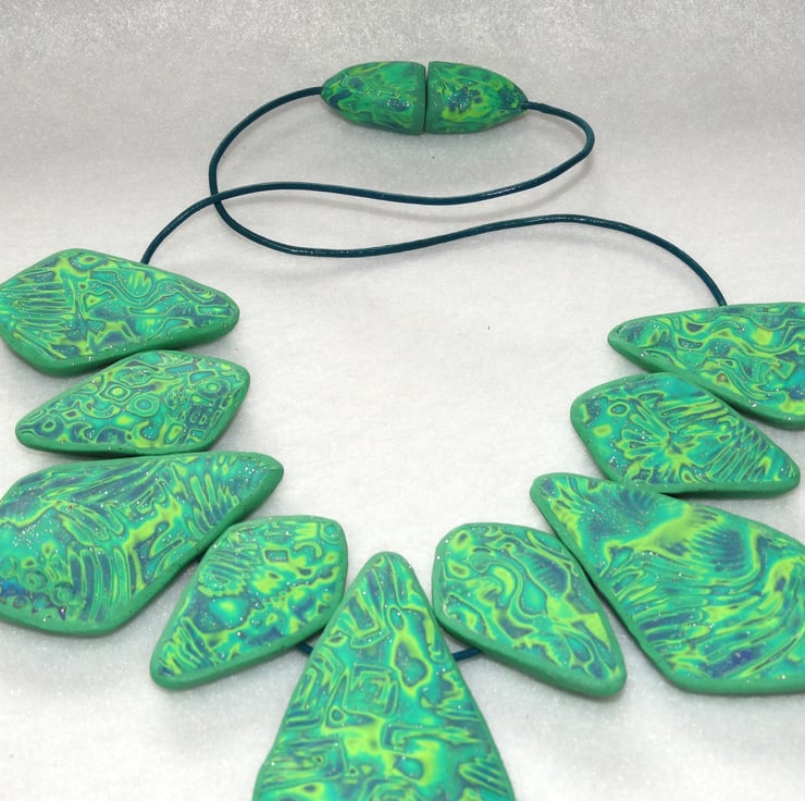 This necklace has been made by me using Polymer Clay. The process involves blending colours of raw clay and creating a surface pattern by indenting the clay with a variety of shapes and texture and then carefully shaving away layers to produce an interesting design.