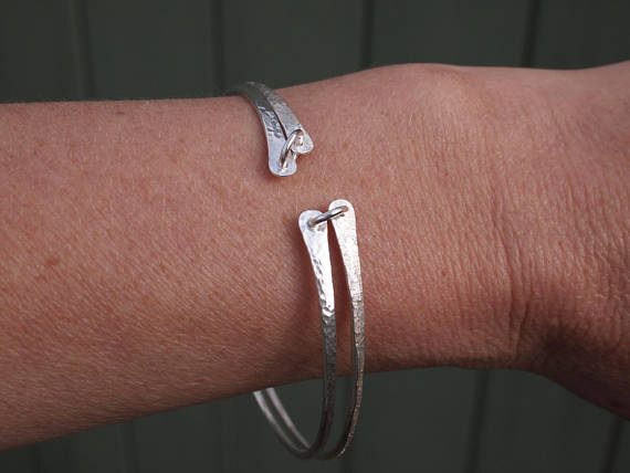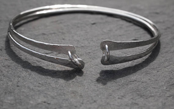 This handmade silver bangle bracelet has two bangles that are joined together at the ends by a ring of silver.