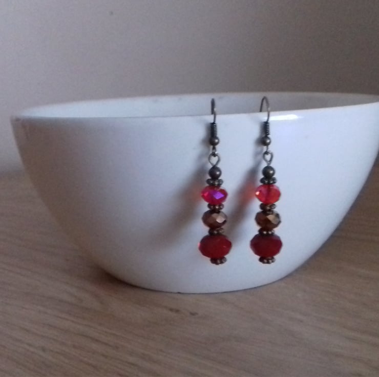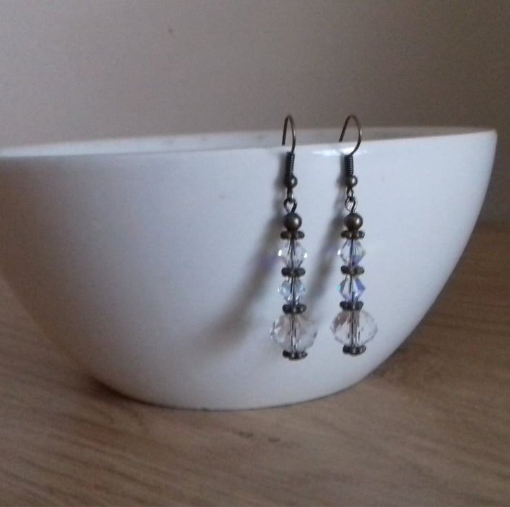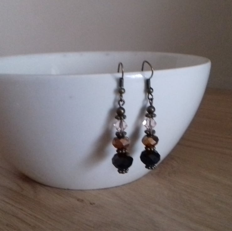 THE EARRINGS HAVE BEEN MADE WITH FACETED GLASS RONDELLE BEADS IN THE SHADES OF METALLIC BLACK AND ANTIQUE GOLD ALONG WITH SWAROVSKI BICONE CRYSTALS IN SHADE OF CHAMPAGNE. DAISY SPACER AND FISH HOOK EAR WIRES ARE IN ANTIQUE BRONZE.