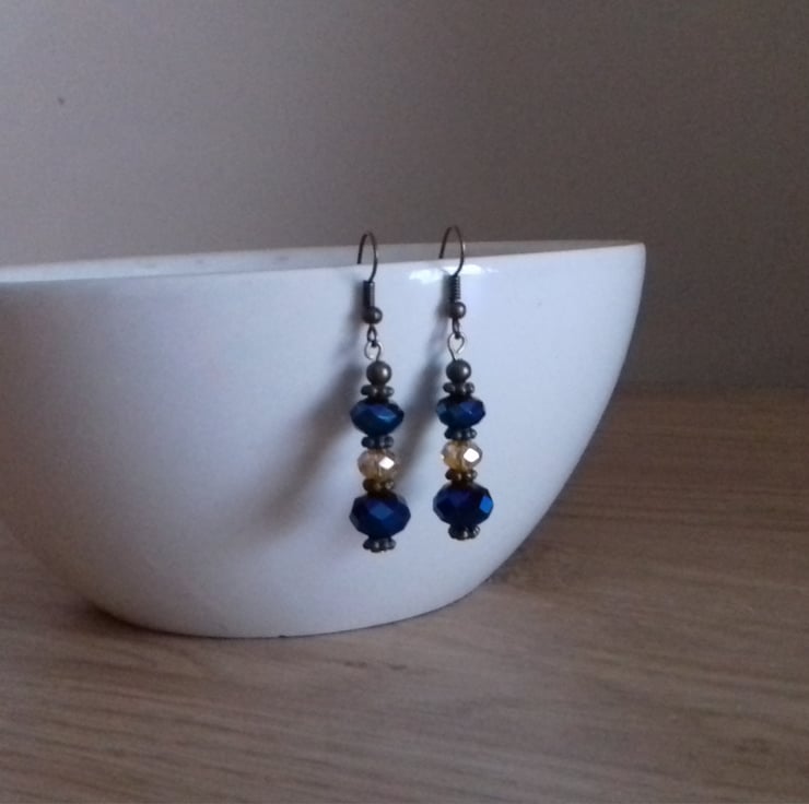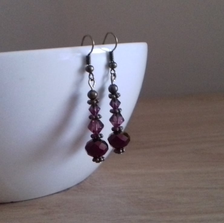 THE EARRINGS HAVE BEEN MADE USING FACETED HAND CUT GLASS RONDELLE BEADS, AB CRYSTAL SWAROUSKI BICONE CRYSTALS ALONG WITH ANTIQUE BRONZE DAISY SPACER BEADS, ROUND SPACER BEADS AND FINISHED WITH ANTIQUE BRONZE FISH HOOK EAR WIRES.