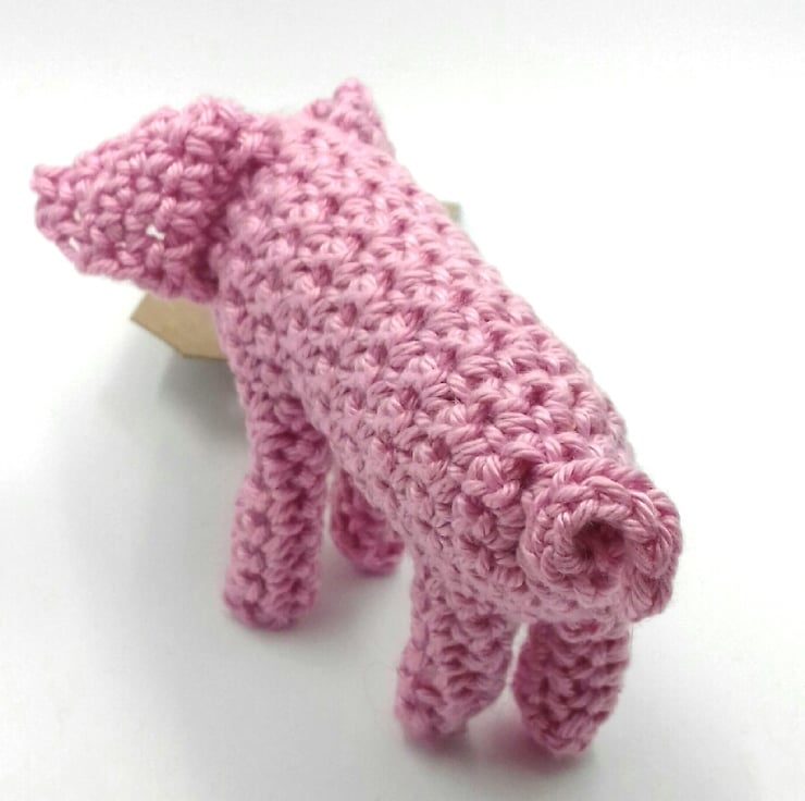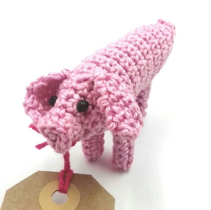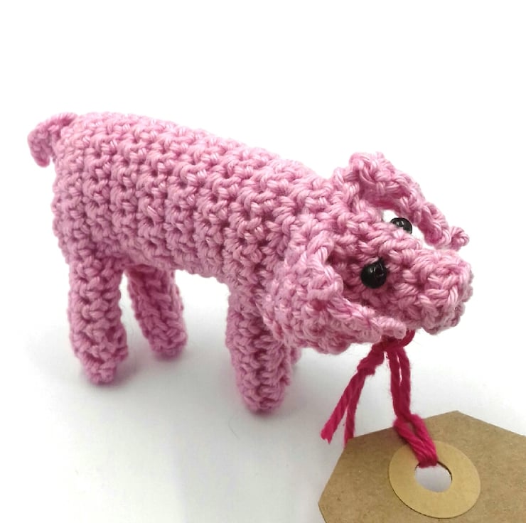 This little piggy will carry a message on your behalf and is a sweet alternative to a greetings card. It is crocheted in cotton from a pattern by Claire Garland. It is filled with polyester stuffing and has tiny beads for eyes. It measures approximately 9 cm from its snout to its curly tail.The tag it carries reads 'Happy Birthday ' on one side and is blank on the other for your own greeting. Please note that I am very happy to exchange this tag for one with a message of your choice. The piggy comes in tissue paper 'straw' in a labelled PIP ( Postage in Proportion ) box all ready to be given or posted on.
