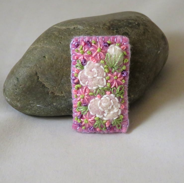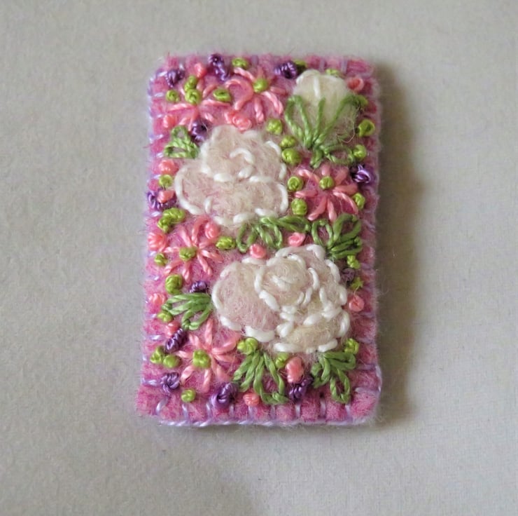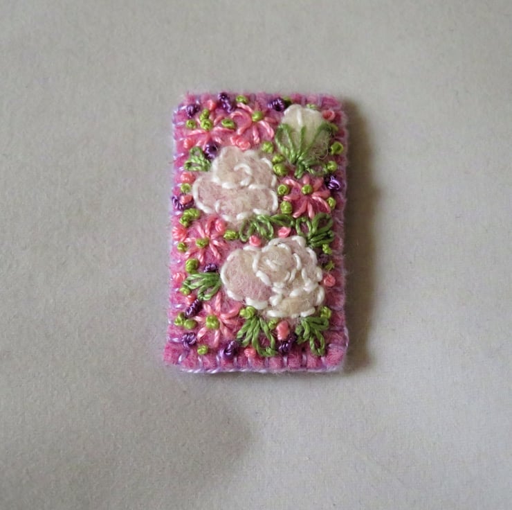 Natural white wool fibres have been needle-felted to a llac felt background to form the basis for the roses. Details of the rose petals have been embroidered in matching threads. The design has been completed by embroidered flowers and foliage in coordinating threads.The back is neatened with a layer of felt interfacing, blanket stitched to the embroidered front in lilac thread. A brooch pin is securely stitched in place.