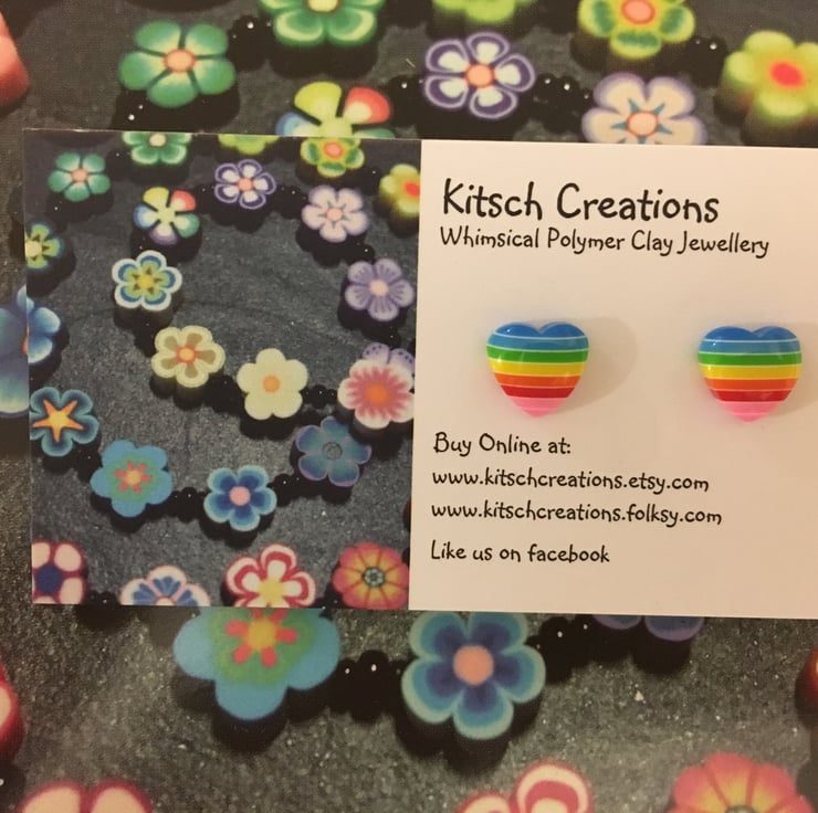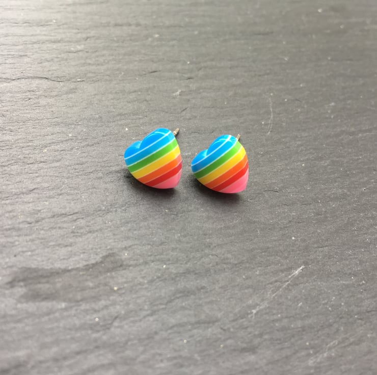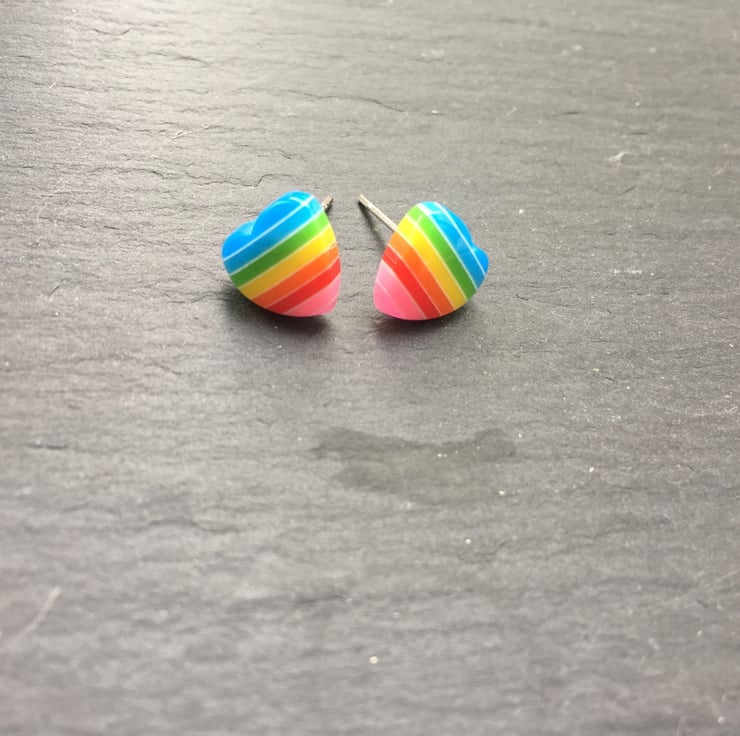 Gorgeous resin rainbow hearts make these lovely statement earrings.