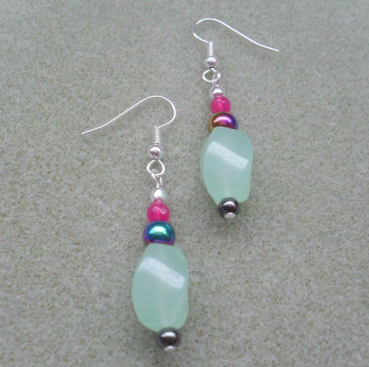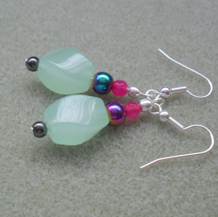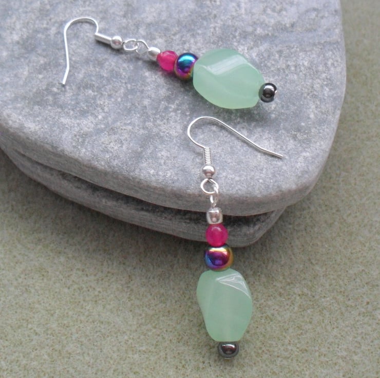 Dyed green and deep pink quartz with rainbow coloured haematite semi precious gemstones are attached to silver plated ear wires