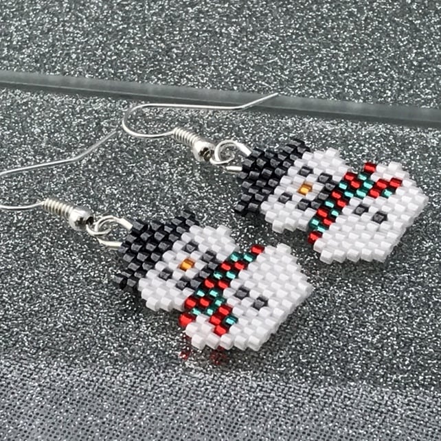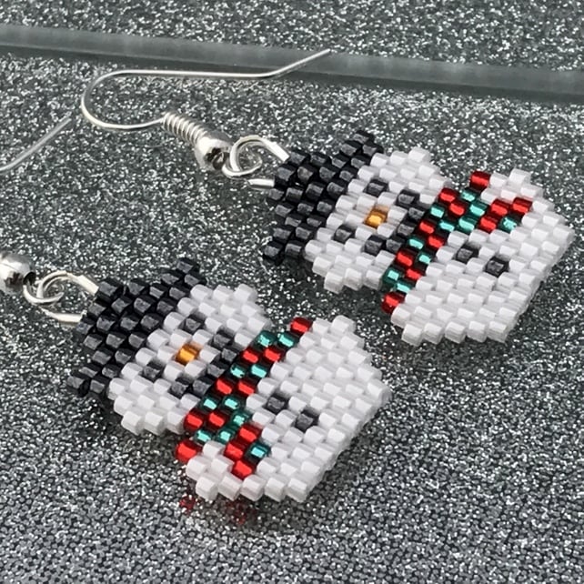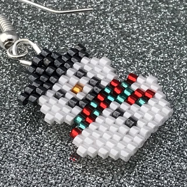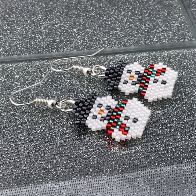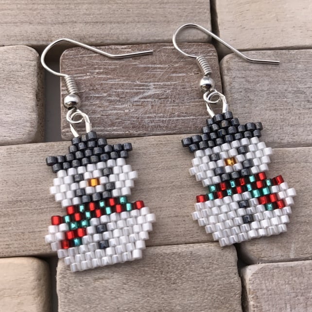 Each snowman has been made by hand sewing small seed beads together using peyote stitch, making them lightweight to wear.