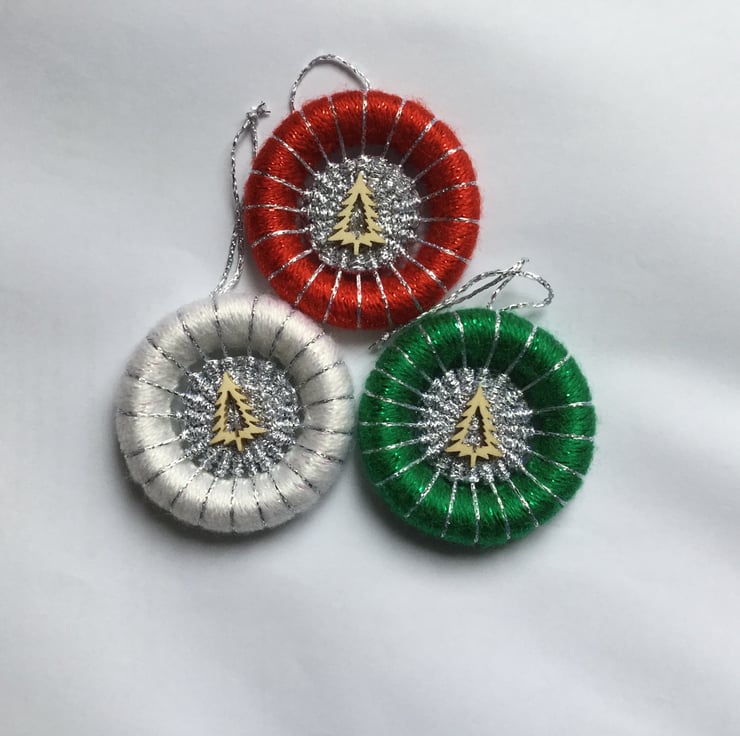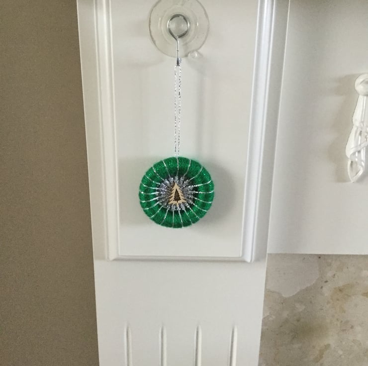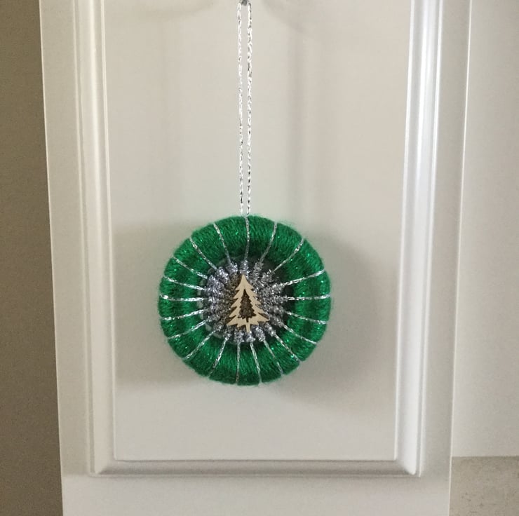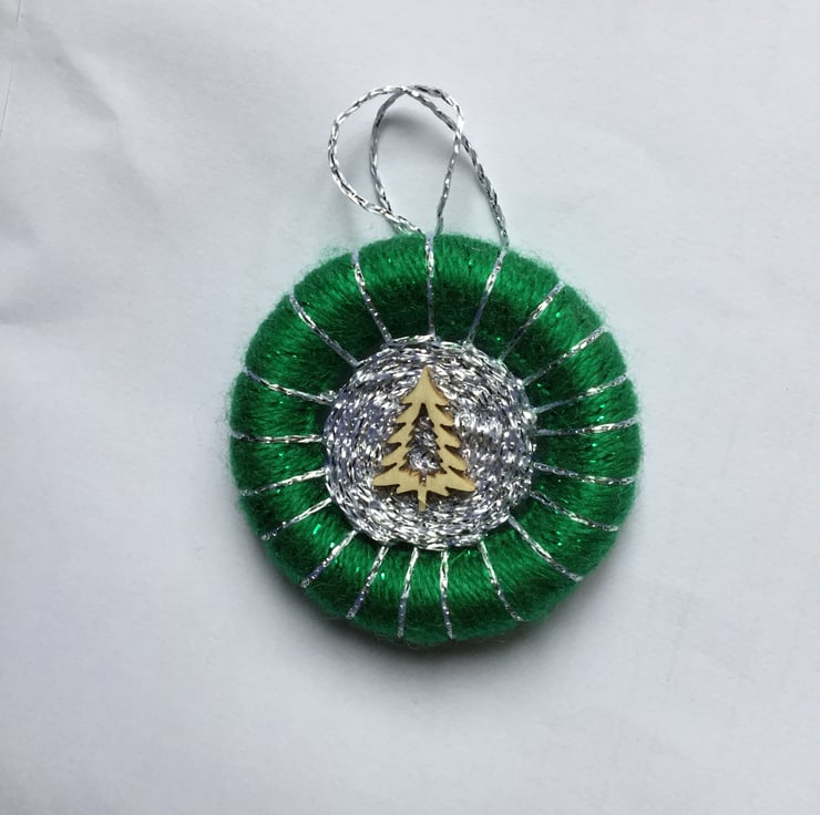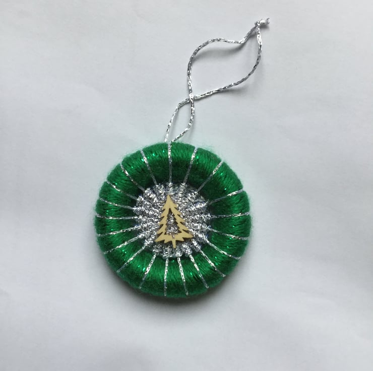 I have made this festive Dorset Button tree decoration in green sparkly yarn and silver thread on a 2" (5cm) wooden ring.