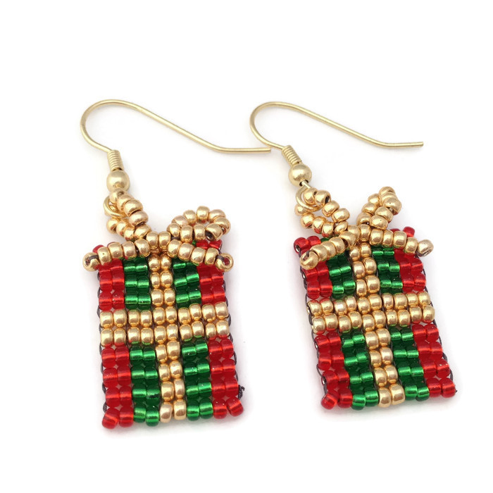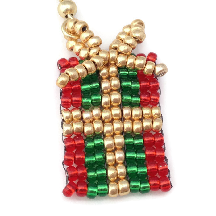 Made by hand sewing size 11/0 Miyuki seed beads in green, red and gold to form a Christmas present shape. I have then created a bow out of the gold seed beads that finishes off the top of the present.
