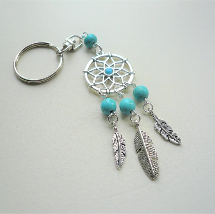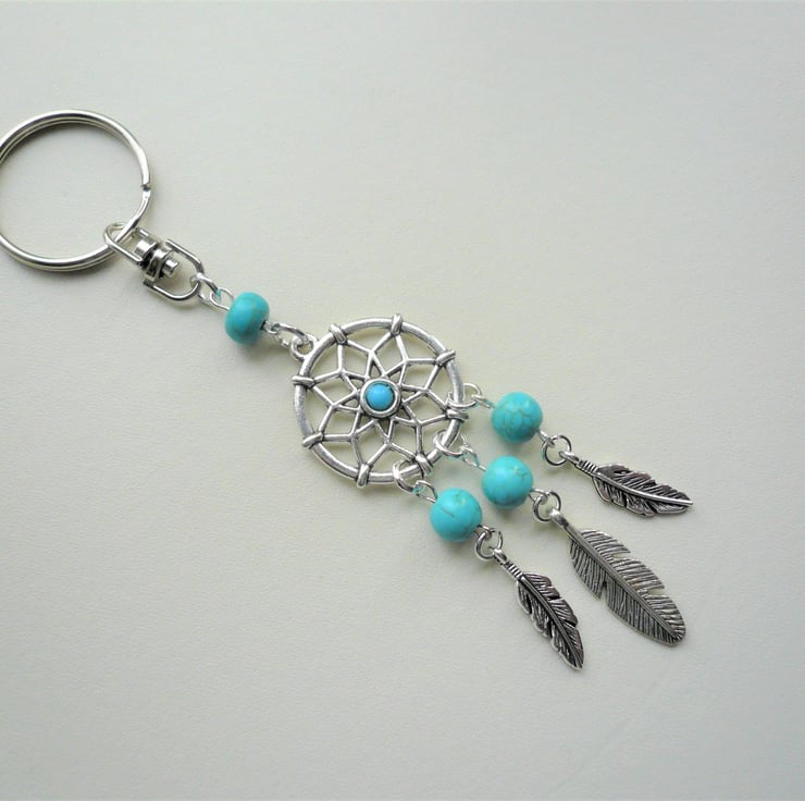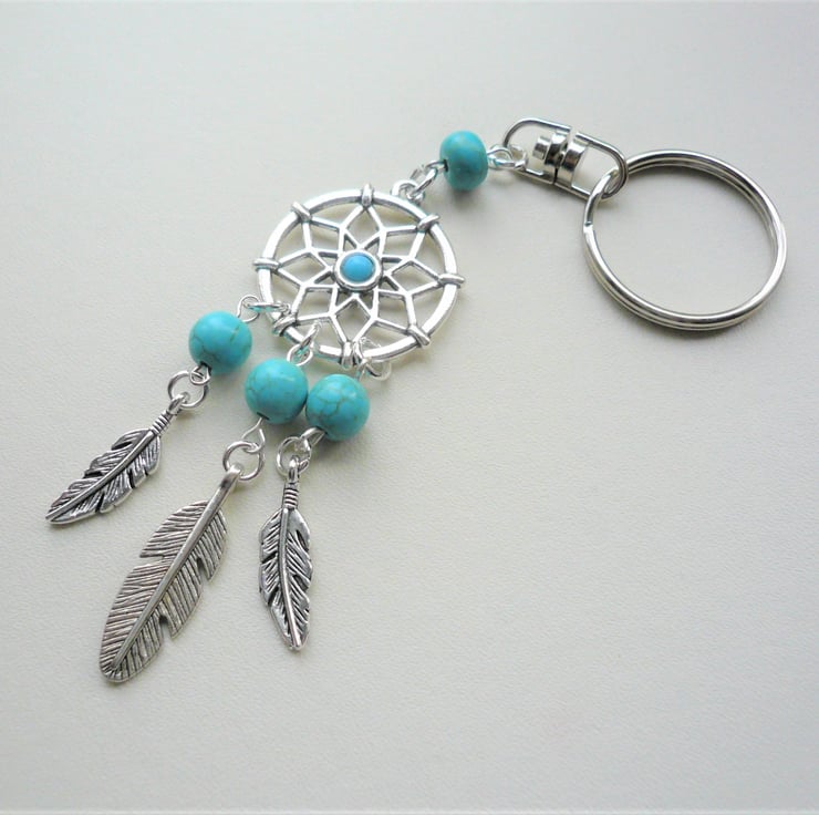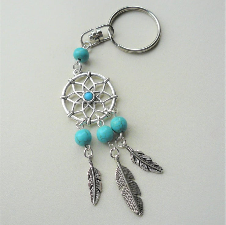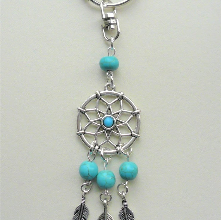 Pretty 28mm round dreamcatcher charm with turquoise Howlite bead centre teamed with matching 8mm round turquoise Howlite beads and three Tibetan silver feather charms. All attached to 30mm silver plated swivel keyring and chain. Total length incl ring is approx 14cm.