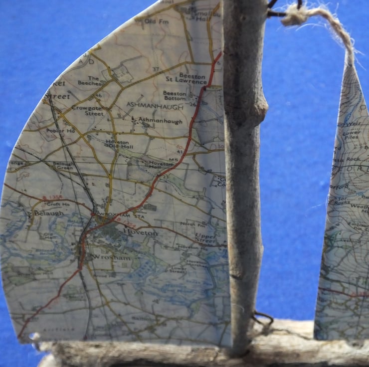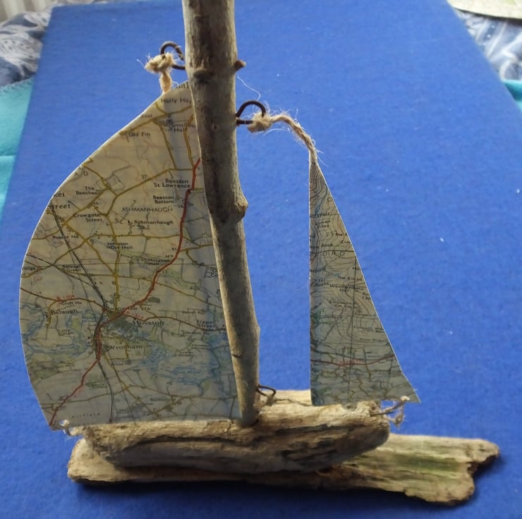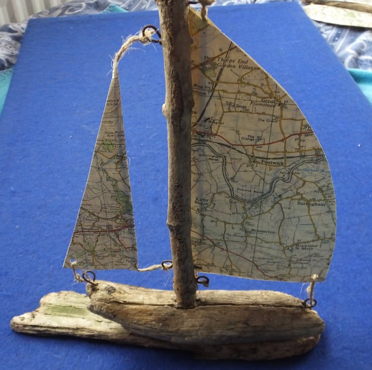 I HAVE MADE SEVERAL SAILING BOATS OR YACHTS USING CORNISH DRIFTWOOD AND OLD ORDNANCE SURVEY MAP, NORTH WEST NORFOLK AS SAILS. THE MAP WAS ONE OF THE LANDRANGER SERIES, No. 132 AND WAS 1:50,000 SCALE.