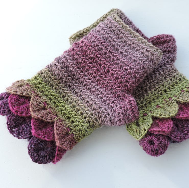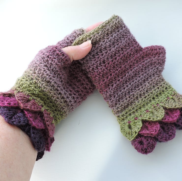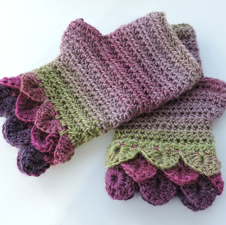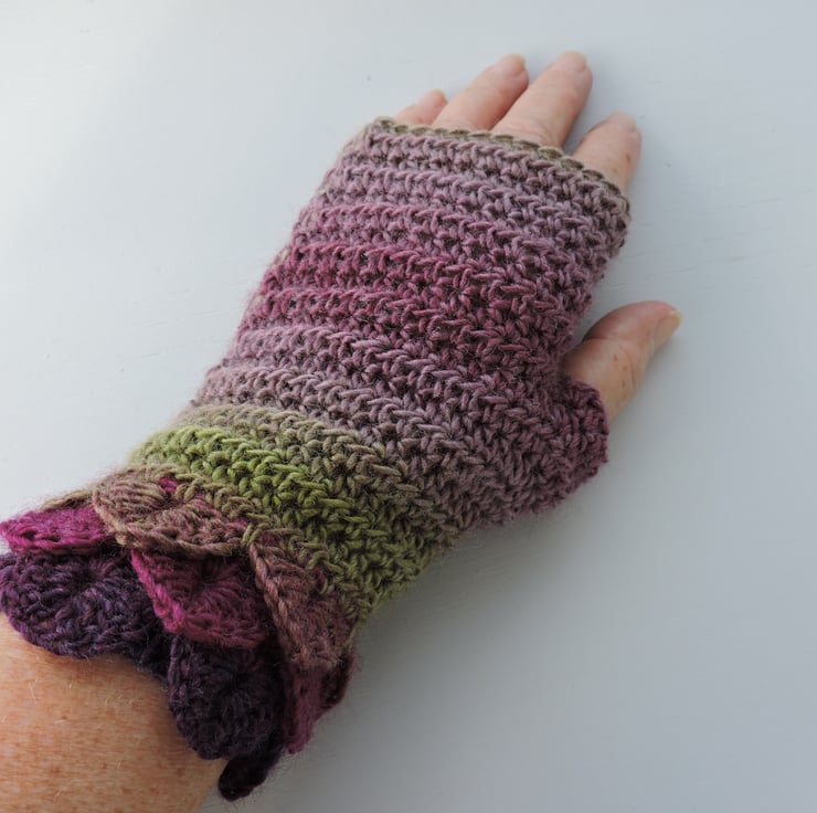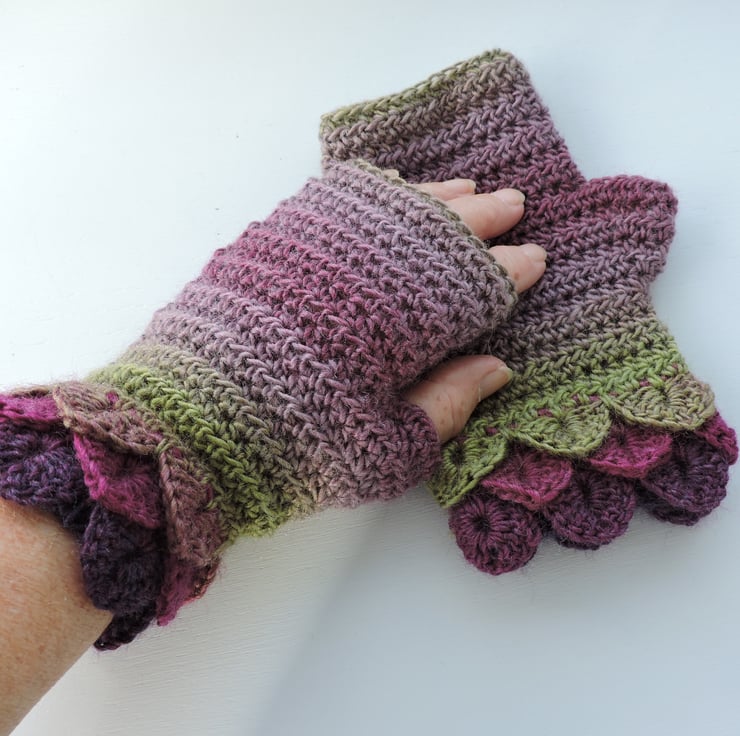 I've crocheted these pretty adults fingerless mitts cum wrist warmers in a soft acrylic and wool double knit multi tonal yarn. Graduated colours of purple, aubergine, sage green and mauve. Fancy Dragon scale stitch cuffs and a plain body. Soft and warm.