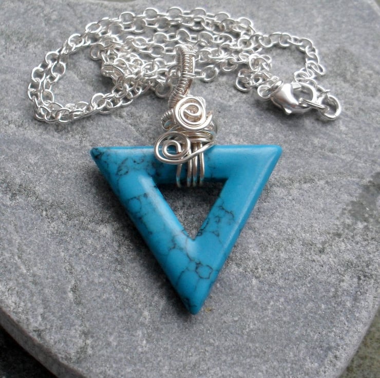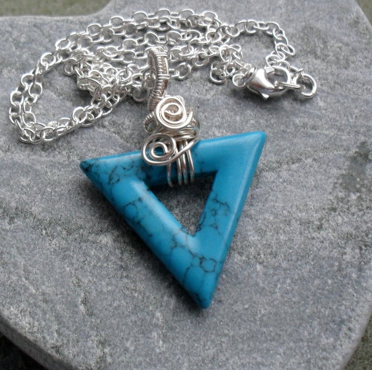 Dyed blue Howlite triangle shaped semi precious gemstone which has been wire wrapped with silver plated wire and has swirls of the wire to add a little decoration.