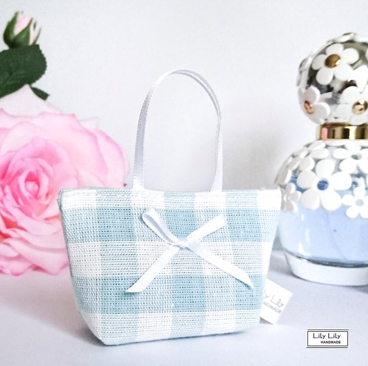 A lavender bag/sachet with lovely scented pure dried lavender which has been handcrafted using quality linen modern duck egg coloured gingham fabric. The lavender bag is decorated with a white satin ribbon bow.