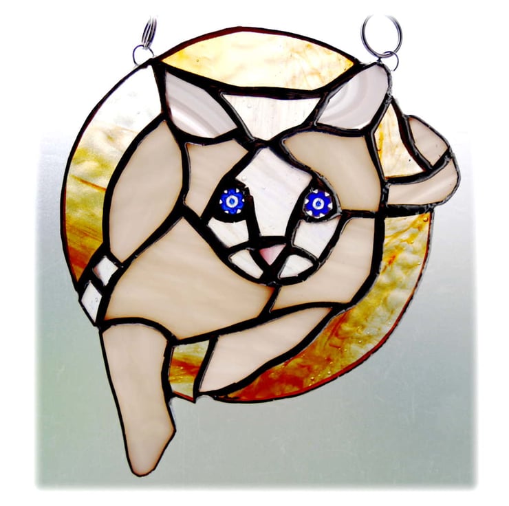 This is a stained glass suncatcher made using the Tiffany copper foil technique.