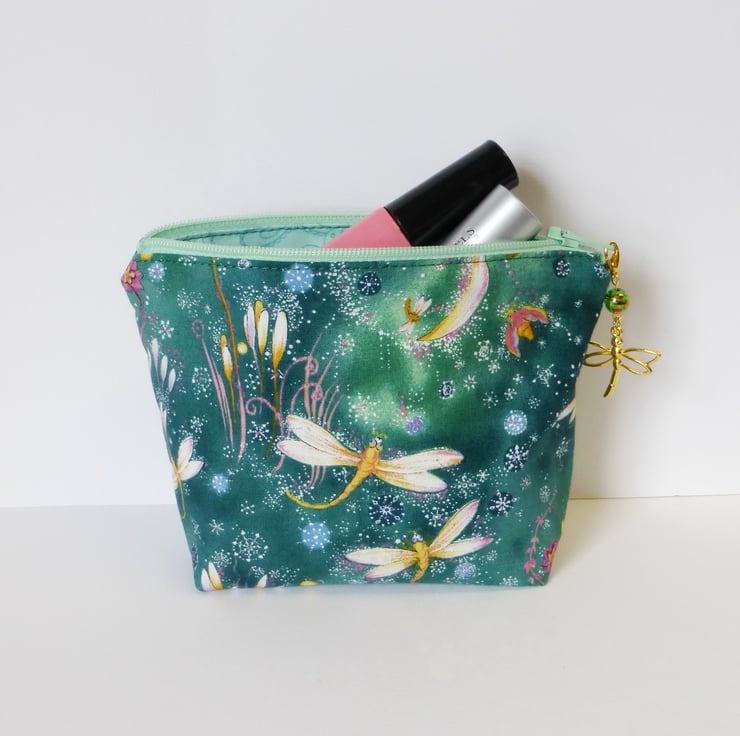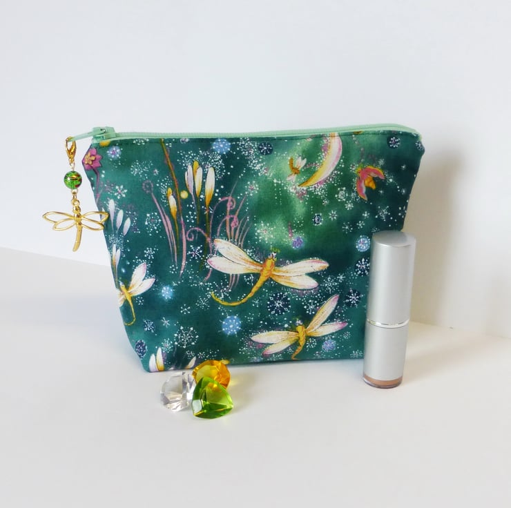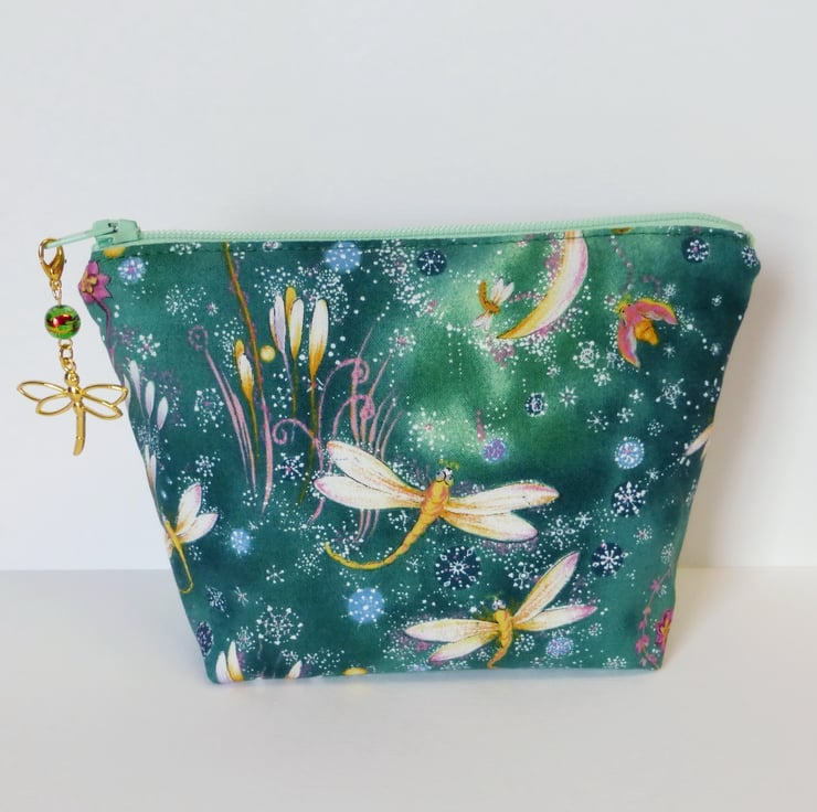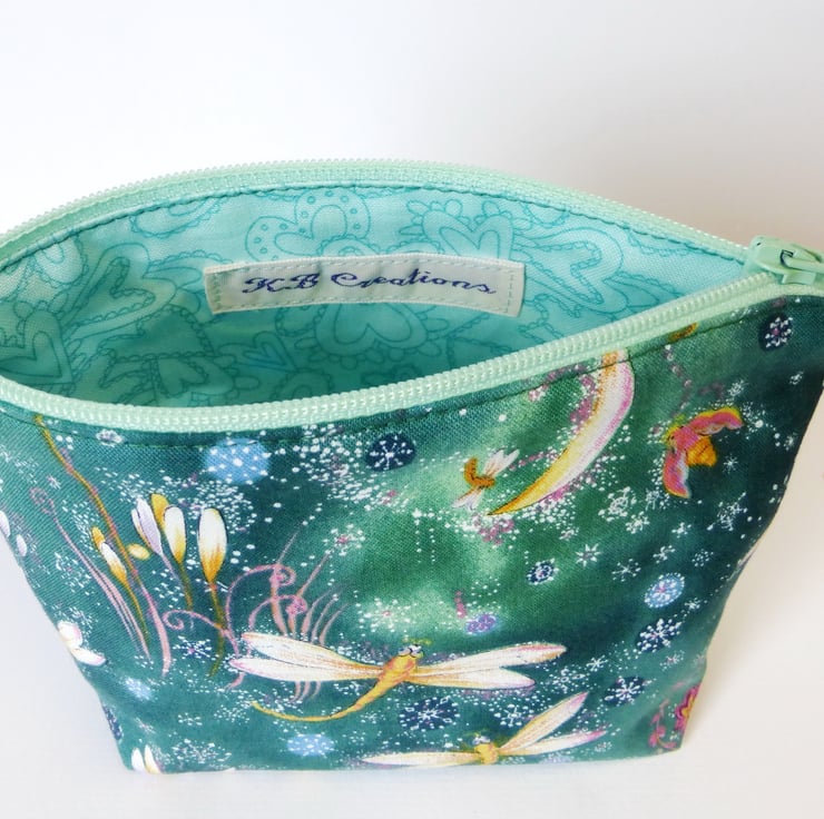 This is my small sized make up bag, made of a lovely 100% cotton fabric in a shade of green, with a dragonfly and flower design in shades of yellow and pink