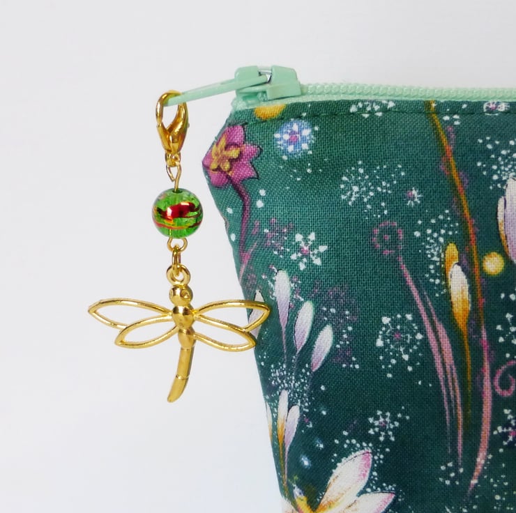 The top of the bag has a pale green zip, and I have added a zip charm with a dragonfly..