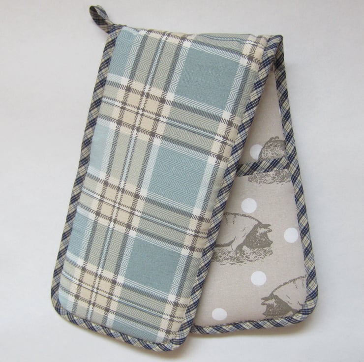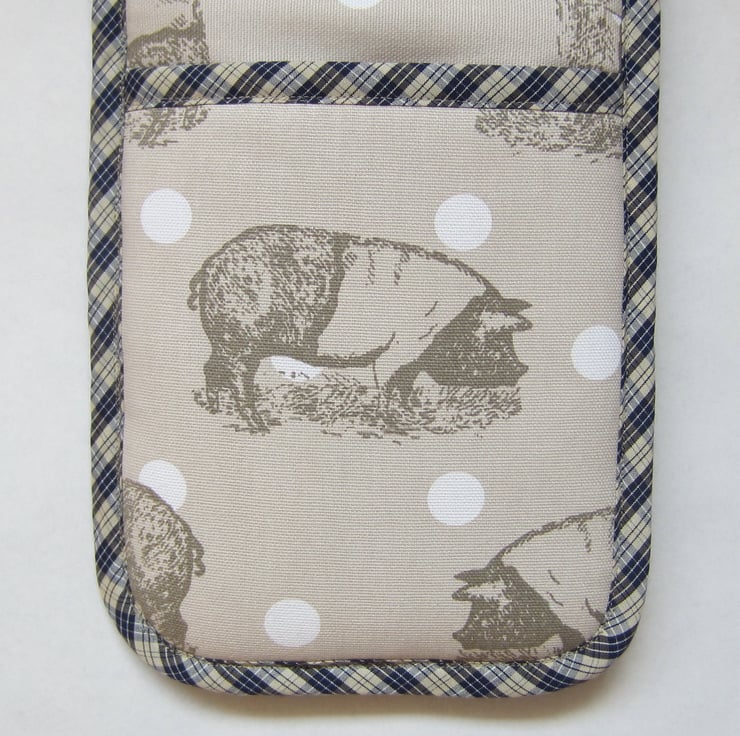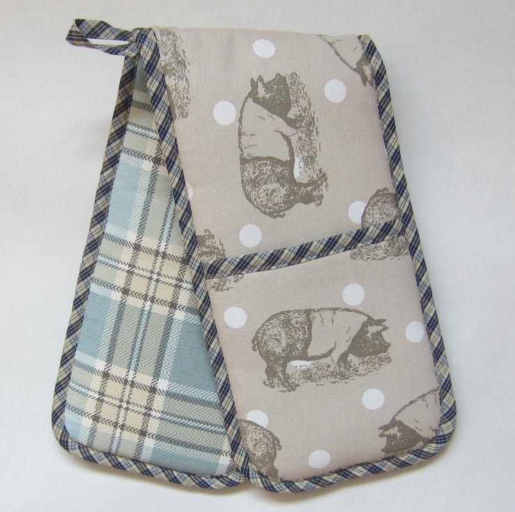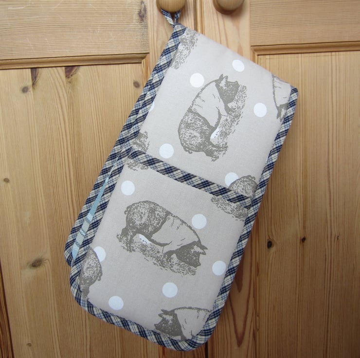 Thickly padded pig and white spot on taupe background oven gloves, backed with a duck egg blue and cream check fabric and edged with a navy check.