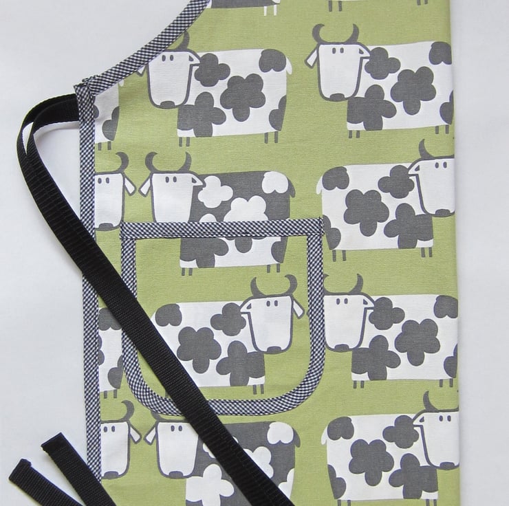 Adult apron in a black and white cow design on a dull lime green background with black and white check edging.