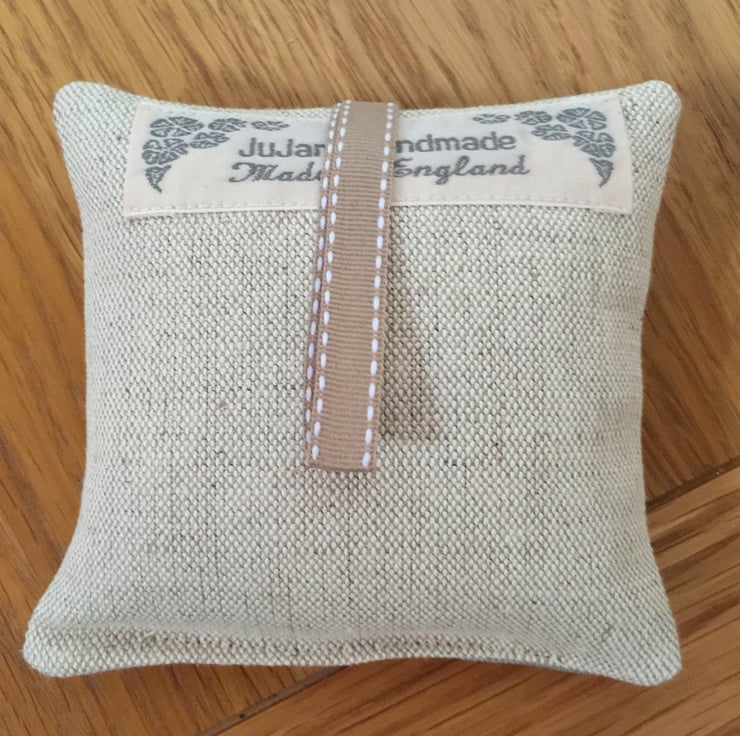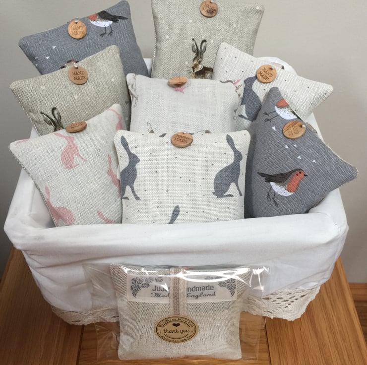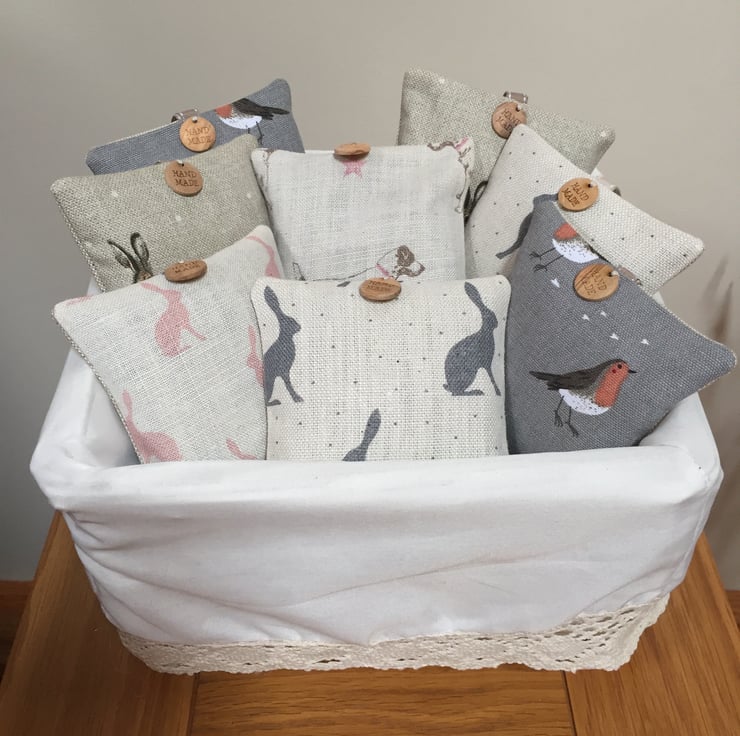 A hanging Lavender sachet constructed from a delightful robin linen fabric and backed with a natural coloured linen.The sachet has been embellished with a "Hand Made " wooden tag.Generously filled with fragrant Cotswold Lavender.A lovely item perfect to fragrance wardrobes, drawers , boot/ utility room or alternatively just hung as a decorative item in your home.