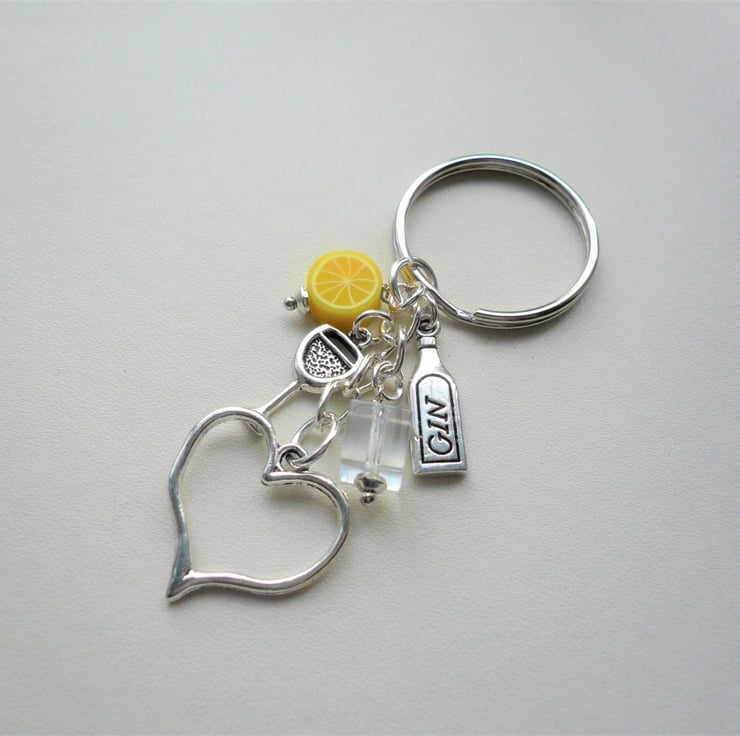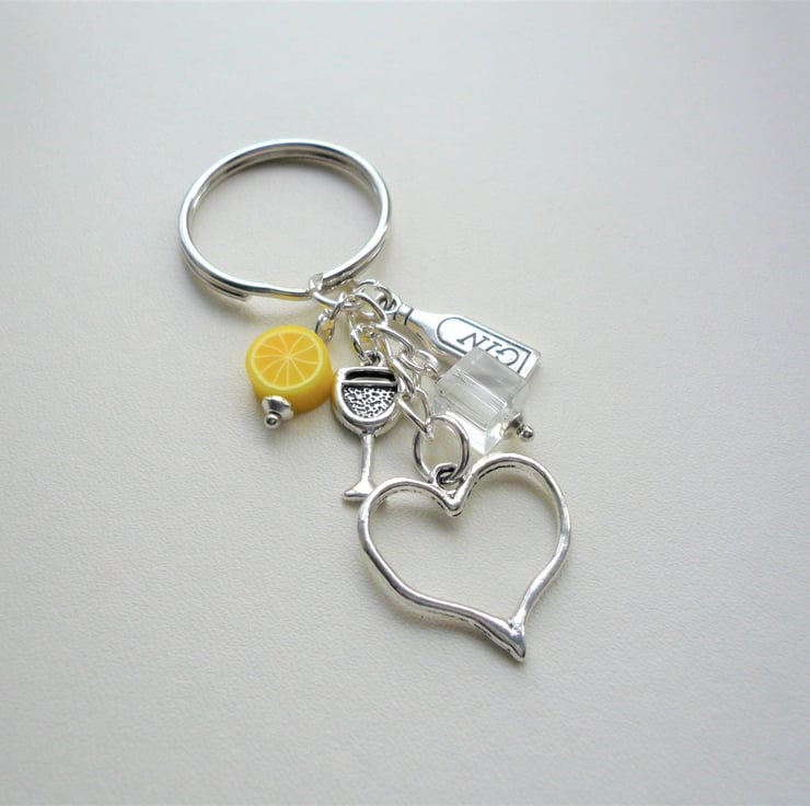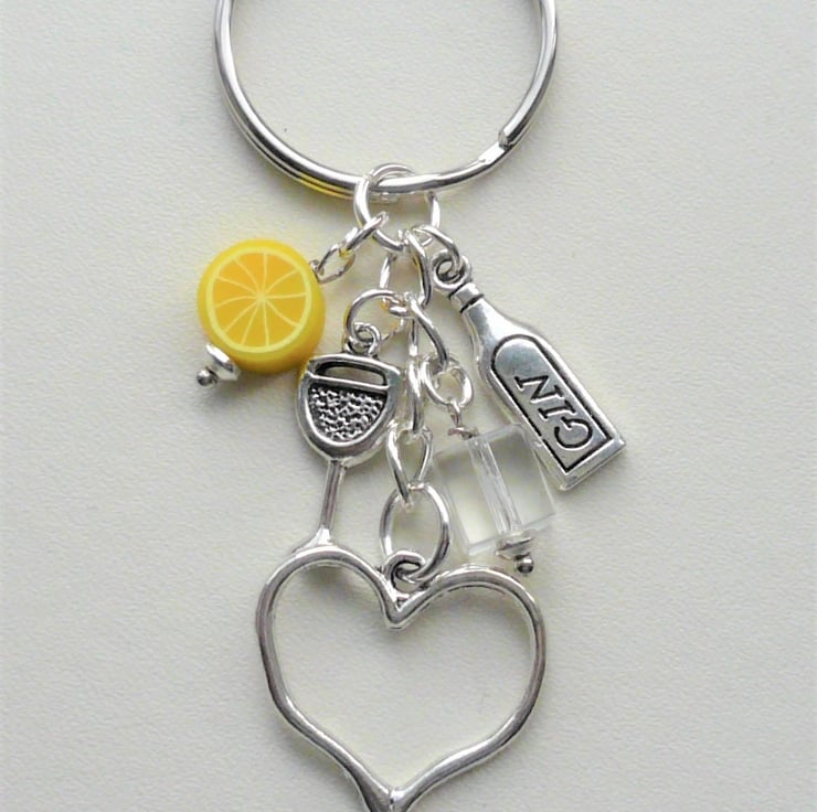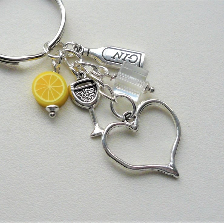 Fun Gin and Tonic themed keyring or handbag charm made up of 10mm round polymer clay lemon slice bead, clear glass 'ice' cube teamed with Tibetan silver charms - gin bottle and glass with 20mm outline heart charm which hangs below. All attached to 30mm silver plated keyring and chain and measures approx 8cm incl ring.