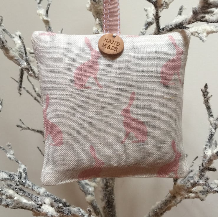 A hanging Lavender sachet constructed from a delightful pink hare linen fabric and backed with a natural coloured linen. The sachet has been embellished with a " Hand Made " wooden tag.Generously filled with fragrant Cotswold lavender.A lovely item perfect to fragrance wardrobes,drawers, boot/ utility rooms or alternatively just hung as a decorative item in your home.